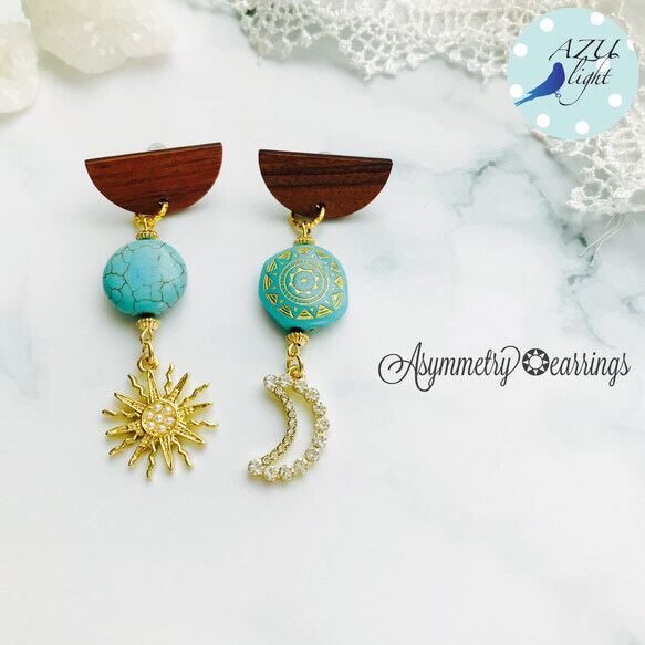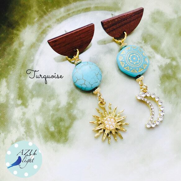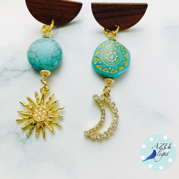 ターコイズ(16×16×7㎜)&太陽柄アクリルビーズ(17×18×5.5㎜)&模造パール付き太陽モチーフ(直径19.5×2㎜)&ラインストーン付き三日月モチーフ(19×13×2.5㎜)&三日月型木製ピアスベース(26×13×2㎜/925シルバー製/AAA+++)を合わせた、大人カジュアルな大ぶりアシンメトリーピアスです。