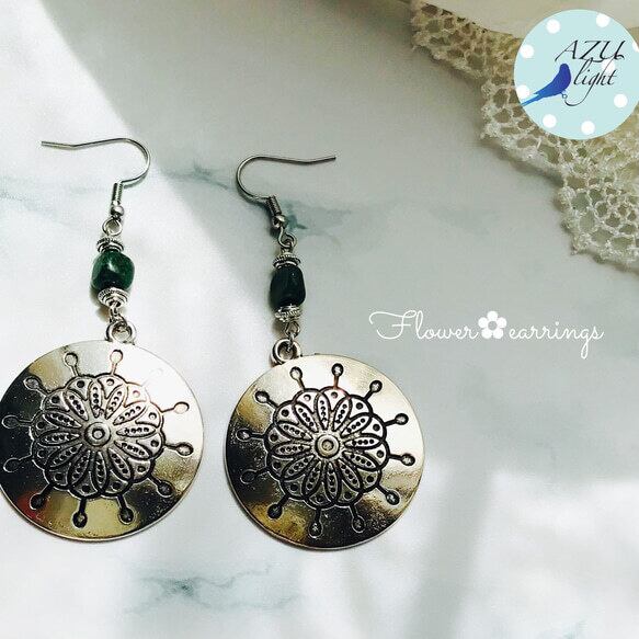 アフリカンジェイド(約5〜6㎜)&フラワーモチーフ(直径/34.5㎜)を合わせた、大人カジュアルな大ぶりピアスです。