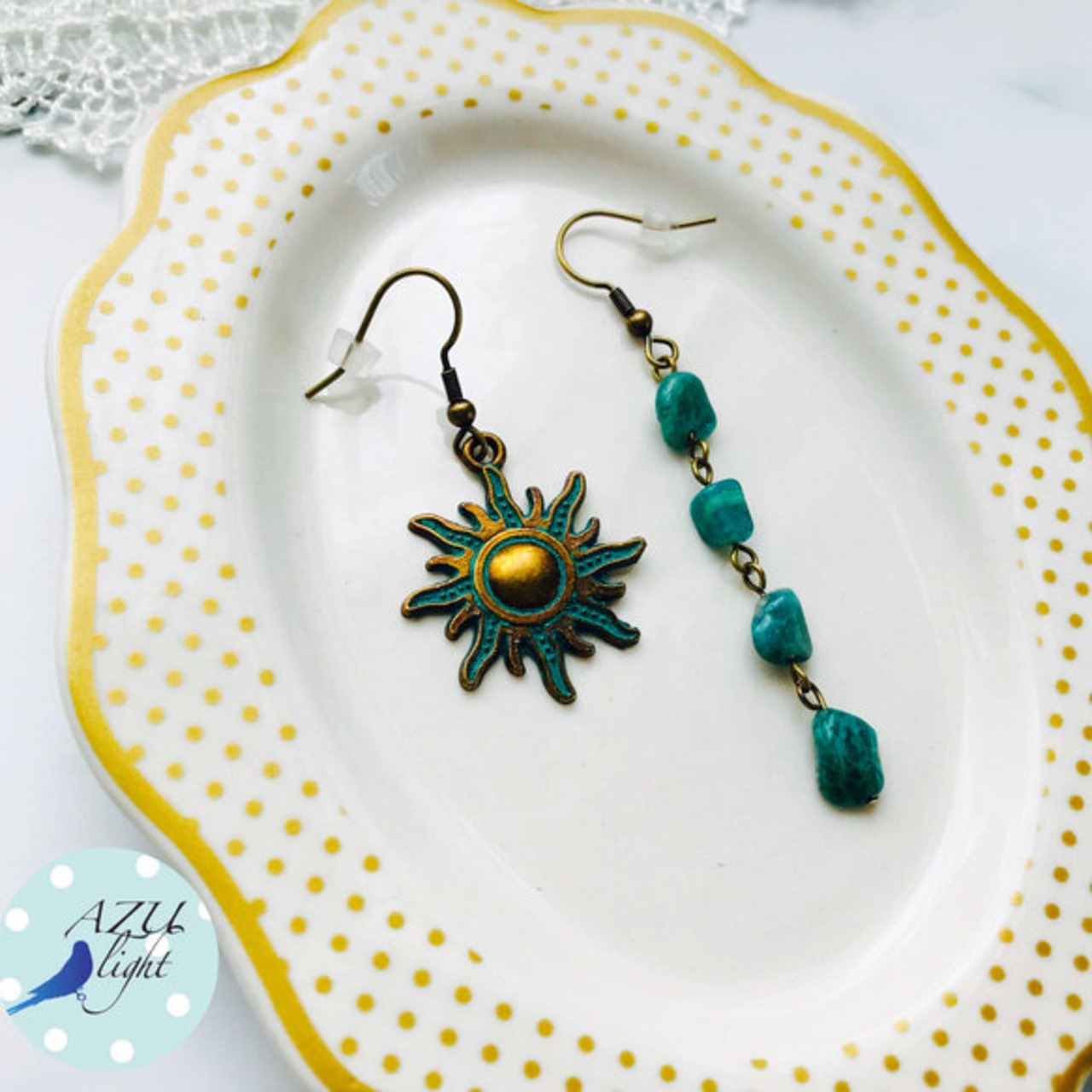 アマゾナイト(約4〜9㎜)&太陽モチーフ(直径/24.5㎜)を合わせた、オリエンタルカジュアルなアシンメトリーピアスです。