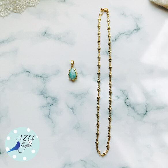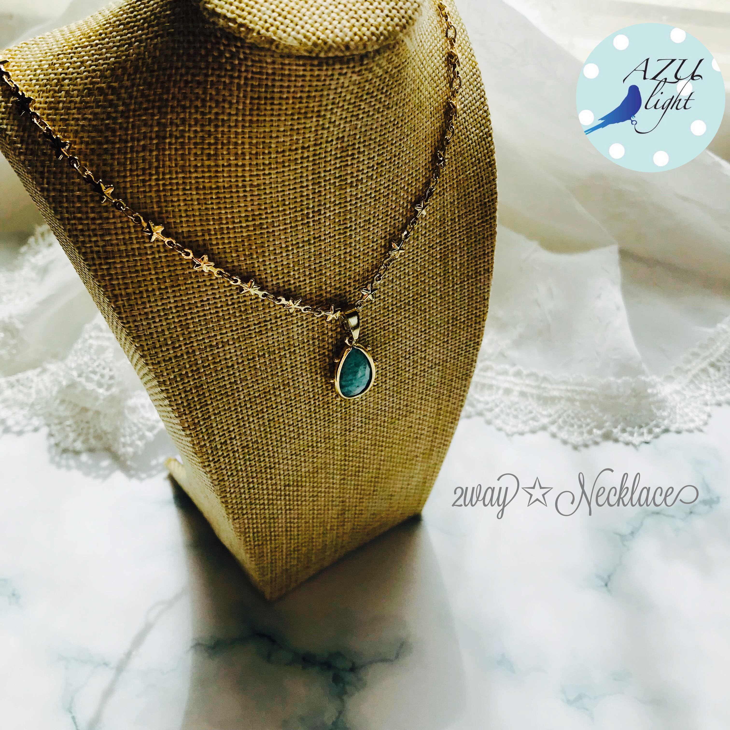 ティアドロップ型アマゾナイト(22.5×14×5.5㎝/真鍮製フレーム)&星型チェーン(幅/5㎜)&三日月型フープ(約10.5×7㎜)を合わせた、ポップでカジュアルな2wayネックレスです。