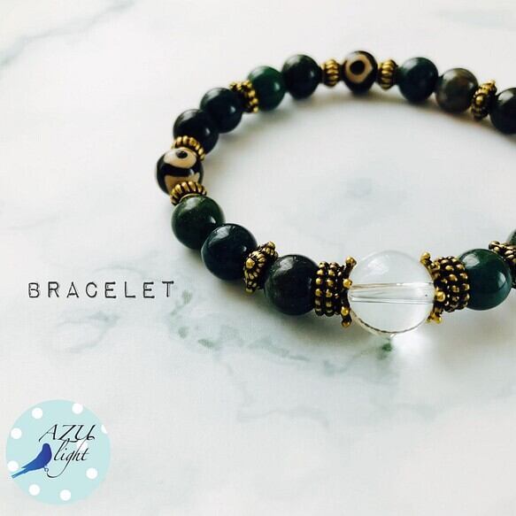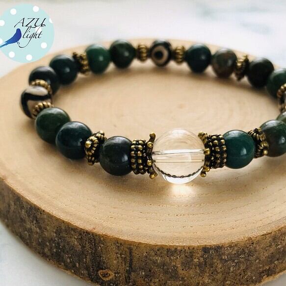 天然水晶(12㎜玉/AAA)&インド瑪瑙/インディアンアゲート(8㎜玉/A)&三眼天珠(8㎜玉)&アンティークゴールドカラーのメタルパーツを合わせた、オリエンタルカジュアルなブレスレットです。