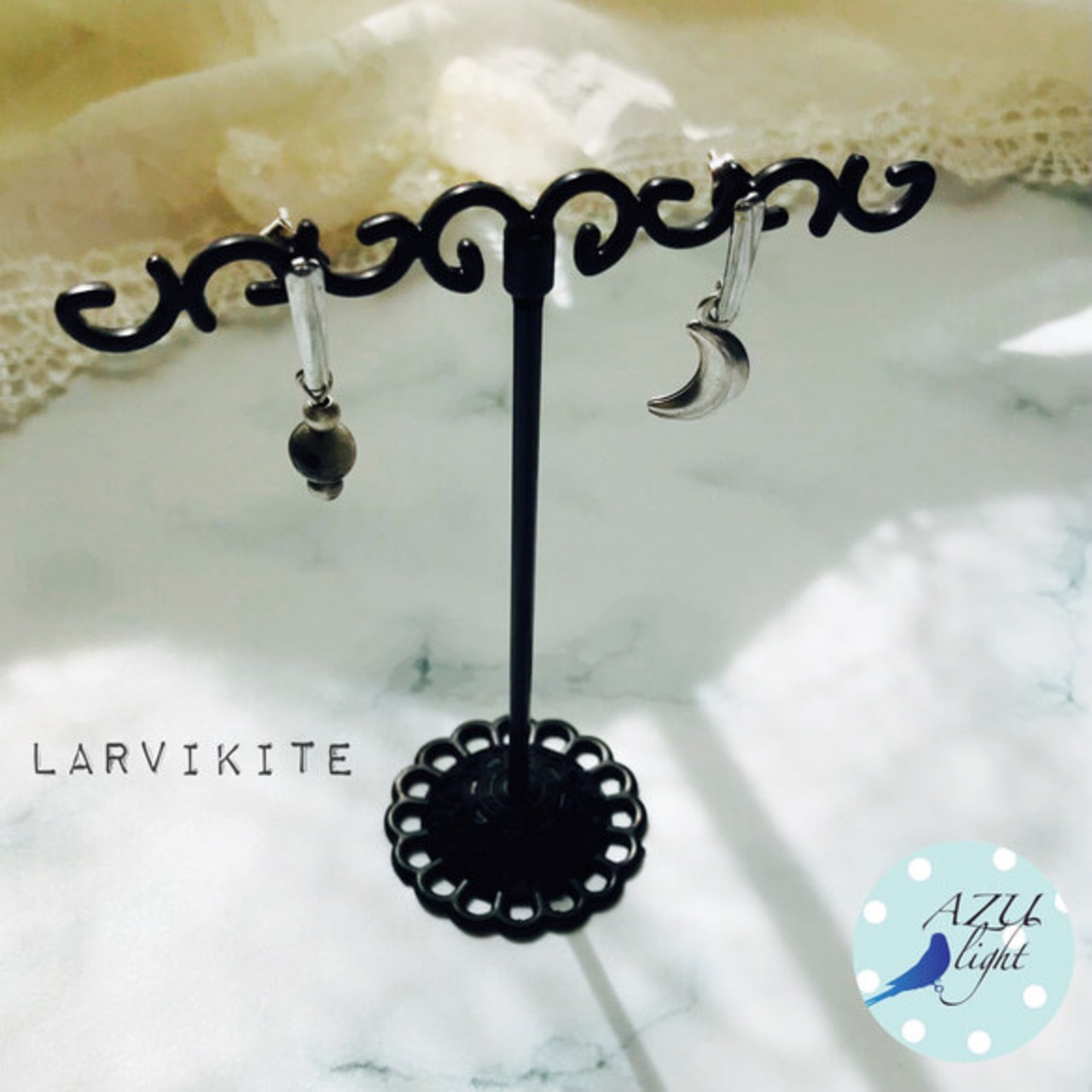 ラルビカイト(6㎜玉)& 三日月モチーフ(16×8×3mm/ステンレススチール製)&メタルビーズ(3.5㎜玉)&縦長ピアスベース(15×3㎜/ 304ステンレス製)を合わせた、軽量でカジュアルなアシンメトリーピアスです。