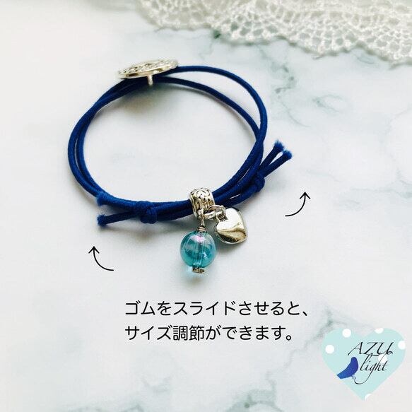 手首に付けると、ブレスレットとしてもお楽しみいただけます。(ヘアゴムをスライドさせるとサイズ調節が可能です。)