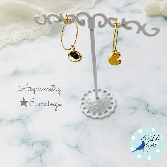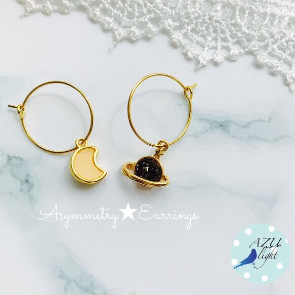 三日月型ドゥルージーアゲート(10.5×8×3.5㎜)&土星モチーフ(10.5×14×6㎜/ガラス製)を合わせた、ポップで大人カジュアルなアシンメトリーフープピアスです。