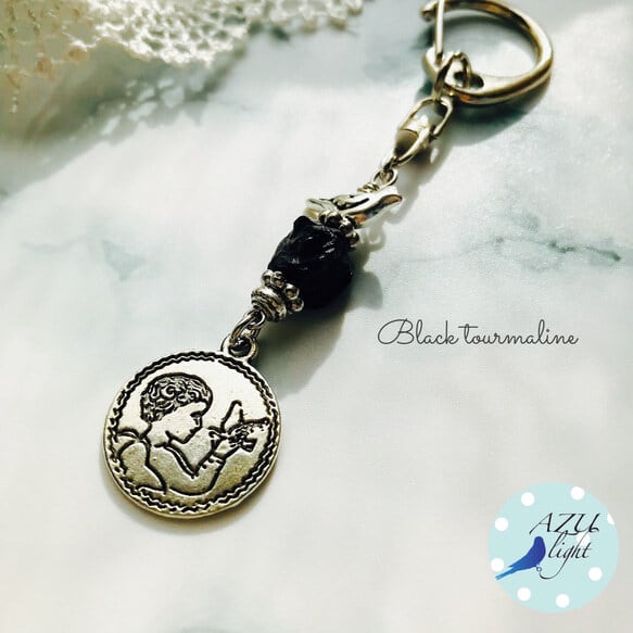 ブラジル産ブラックトルマリン(約10×10×9㎜)&鳥モチーフのメタルビーズ(7×14×4.5㎜/カドミウム&鉛フリー)&天使と鳥モチーフ(直径19㎜/カドミウム&鉛フリー/両面同柄)を合わせた、大人カジュアルなキーホルダー/バッグチャームです。