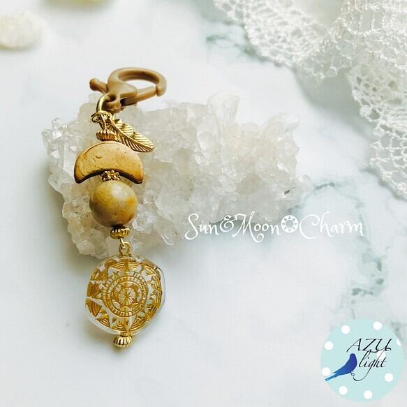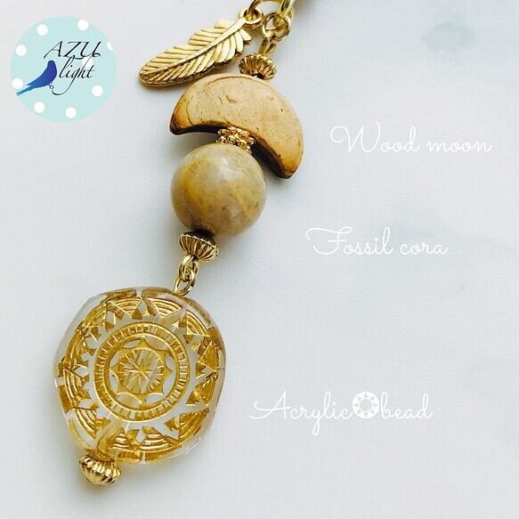 インドネシア産フォシルコーラル(約10.5㎜玉)&三日月型ウッドビーズ(約10×15×4㎜)&太陽柄アクリルビーズ(約17×17×5.5㎜)&羽モチーフ(約15×7㎜)&高品質プラスチック製ナスカン(全長25㎜)を合わせた、ボヘミアンカジュアルな大ぶりチャームです。