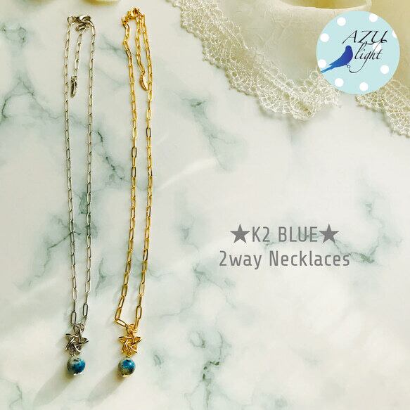 ヒマラヤ産K2アズライト(約8.5㎜玉)&五芒星モチーフ(直径/12㎜)&羽モチーフ(約10×4㎜)&真鍮製チェーンを合わせた、カジュアルなユニセックス2wayネックレスです。