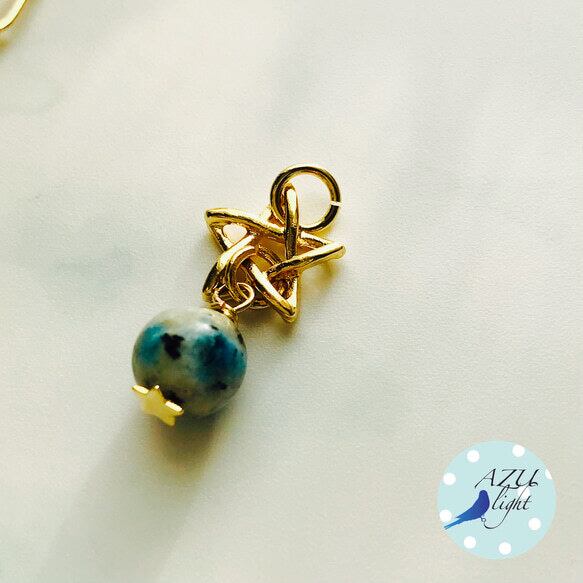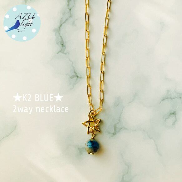 ヒマラヤ産K2アズライト(約8.5㎜玉)&五芒星モチーフ(直径/12㎜)&羽モチーフ(約10×4㎜)&真鍮製チェーンを合わせた、カジュアルなユニセックス2wayネックレスです。