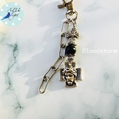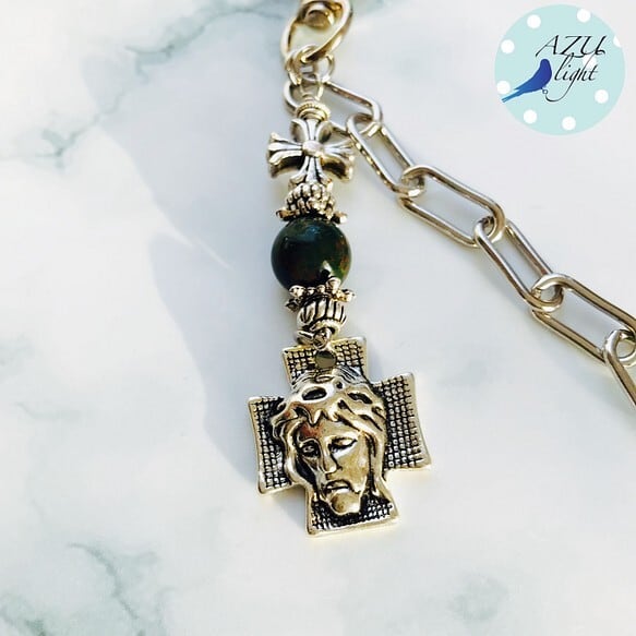 インド産ブラッドストーン(10㎜玉)&イエスモチーフ(約23×20㎜)&クロスビーズ(直径/約12㎜)&メタルビーズ&オーバルチェーンを合わせた、2wayキーホルダー/バッグチャームです。