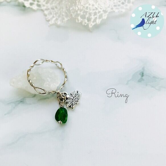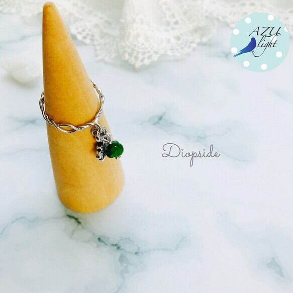 グリーンダイオプサイド(約7×6×4㎜)&蓮モチーフ(10.5×11×2㎜/カドミウム&鉛フリー)を合わせた、エスニックカジュアルな真鍮製リングです。