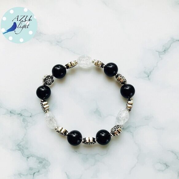 ブラックオニキス(10㎜玉)&タンブル型クラック水晶(約13×10㎜)&フラワーメタルビーズ(直径9㎜)を合わせた、大人カジュアルなブレスレットです。
