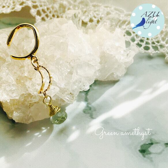 グリーンアメジスト(5×7㎜)&三日月フープ(10×7㎜)を合わせた、フェミニンなイヤーカフです。
