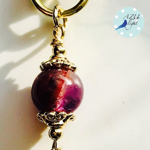 レアストーン、レッドアメジスト/レッドファントムアメジスト(10㎜玉/AA++)&ラインストーン付き三日月と星モチーフ(直径15㎜)を合わせた、エレガントで大人カジュアルなキーホルダーです。