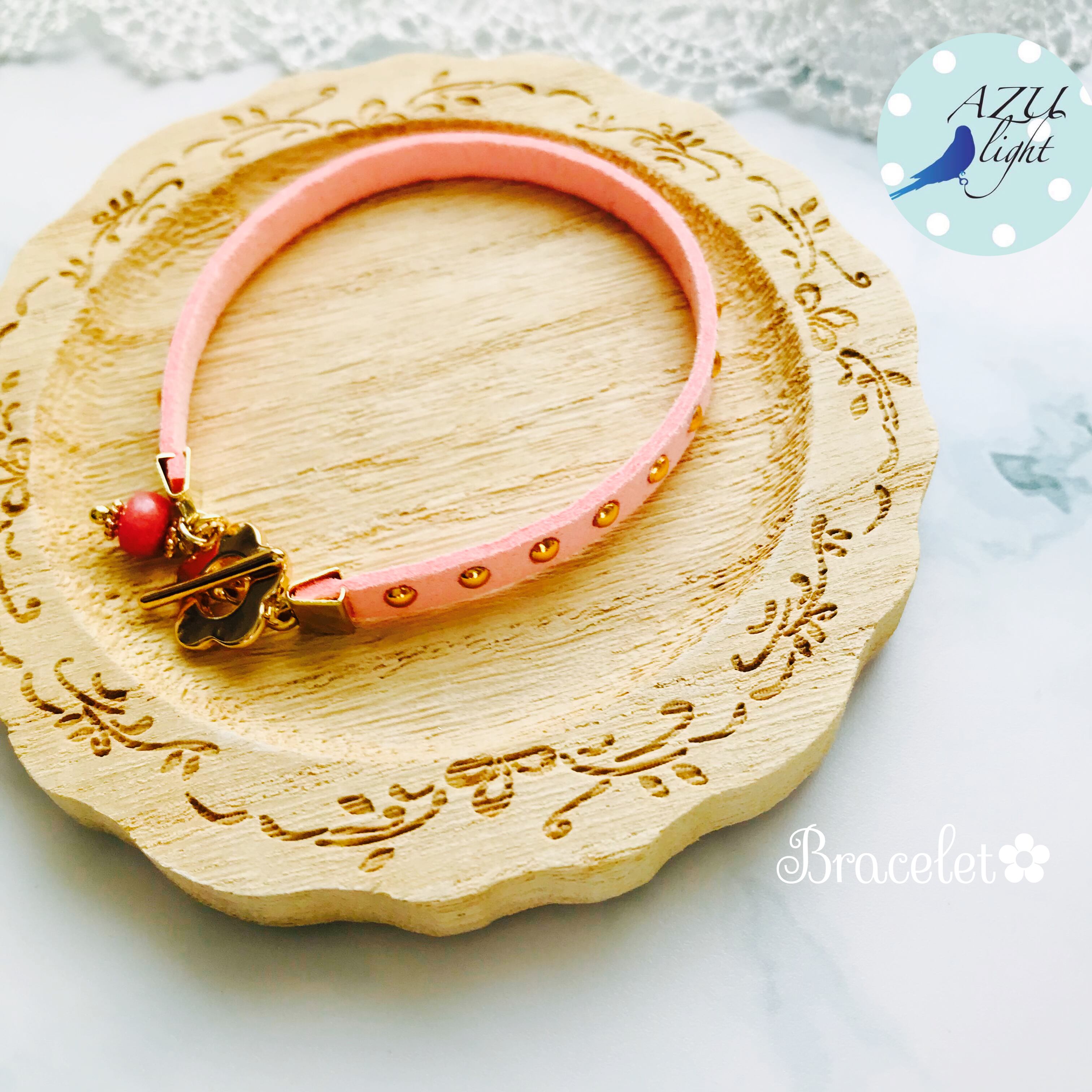 ノルウェー産チューライト(約6×6×4㎜/ボタン型)&スタッズ付きフェイクスエード(幅/5㎜)×フラワーマンテルを合わせた、大人可愛いマンテルブレスレットです。