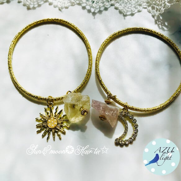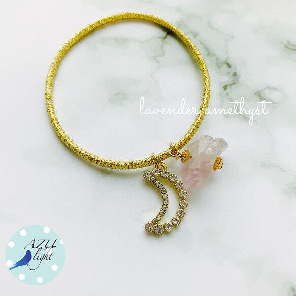 ナゲット型ラベンダーアメジスト(約10×16×15㎜)&ラインストーン付き三日月モチーフ(18×13㎜)を合わせた、大人カジュアルなラメゴールドカラーのヘアゴムです。