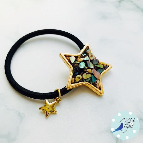 アバロンシェル&星モチーフ(直径/10㎜)を合わせた、大ぶりでカジュアルな、オーロラカラーの星型ヘアゴムです。