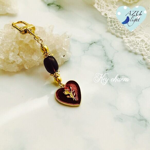 パープルフローライト(14×10×10㎜/ AAA)&薔薇柄ハートモチーフ(21×20㎜)&マットゴールドカラーのメタルビーズ( 6×5㎜/鉛&ニッケル&カドミウムフリー)を合わせた、エレガントなキーホルダー/バッグチャームです。