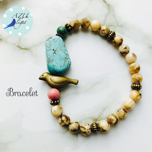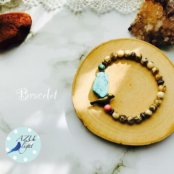 マグネサイトターコイズ(約24×14×6㎜)&小鳥のメタルビーズ(23×8㎜)&ロードナイト(6㎜玉)&アズライト(6㎜玉)&グラフィックグラナイト(6㎜玉)を合わせた、個性的なカジュアルブレスレットです。