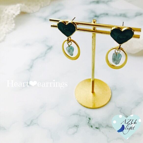 ブルーアパタイト(約7〜8×5〜6×4〜5㎜)&ハート型ピアスベース&マットゴールドカラーのフープ(19×14㎜)を合わせた、大人可愛いピアスです。
