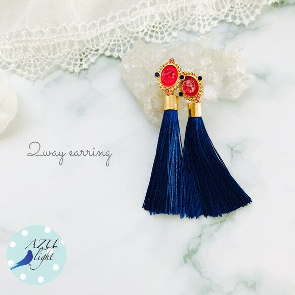 トパーズ (約6〜7×6〜7㎜/AA)&マゼンタカラーのビジュー付きピアスベース(17×14㎜)&ネイビーカラータッセル(5.5㎝)を合わせた、華やかな2wayピアスです。