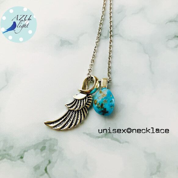 希少/ユニセックス【12月誕生石&獅子座/蟹座/射手座/山羊座の守護石✴︎男女共に力を与える石✴︎英知と高貴さ、不死のシンボル✴︎コミュニケーション能力やリーダーシップを高める✴︎魔除け】スリーピングビューティーターコイズ×羽モチーフのネックレス