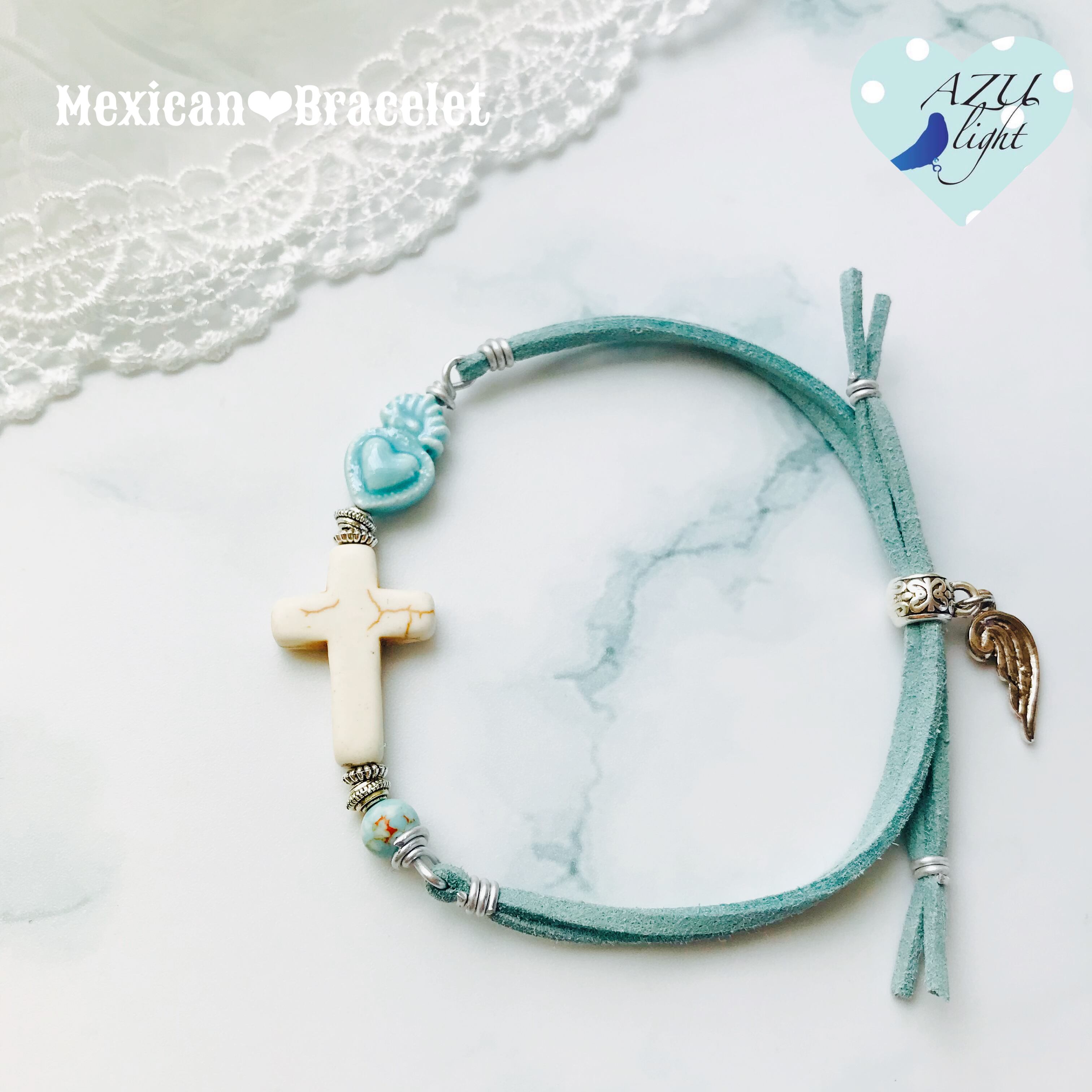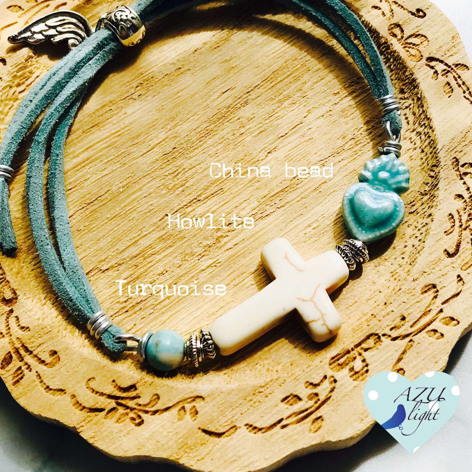 クロス型ハウライト(24.5×18×5㎜)&練りターコイズ(6㎜玉)&ハート型陶器ビーズ(16×10×6㎜)&天使の羽モチーフ(15×9㎜)&カン付きロンデル(8×5.5㎜/カドミウム&鉛フリー)&フェイクスエード(幅2㎜)を合わせた、メキシカンカジュアルなフリーサイズブレスレットです。