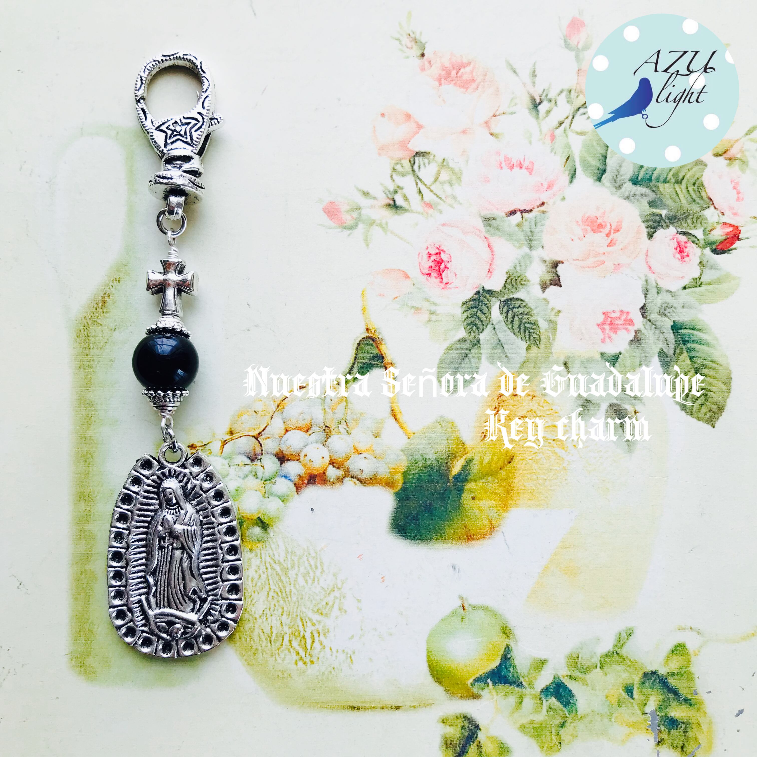 ブラックオブシディアン(10㎜玉)& グアダルーペの聖母マリアモチーフ(両面同柄/34.5x21.5x4.5㎜)&クロスビーズ(9×8×4㎜)& スターカニカン( 30x15x9㎜)を合わせた、ユニセックスデザインのキーホルダー/バッグチャームです。