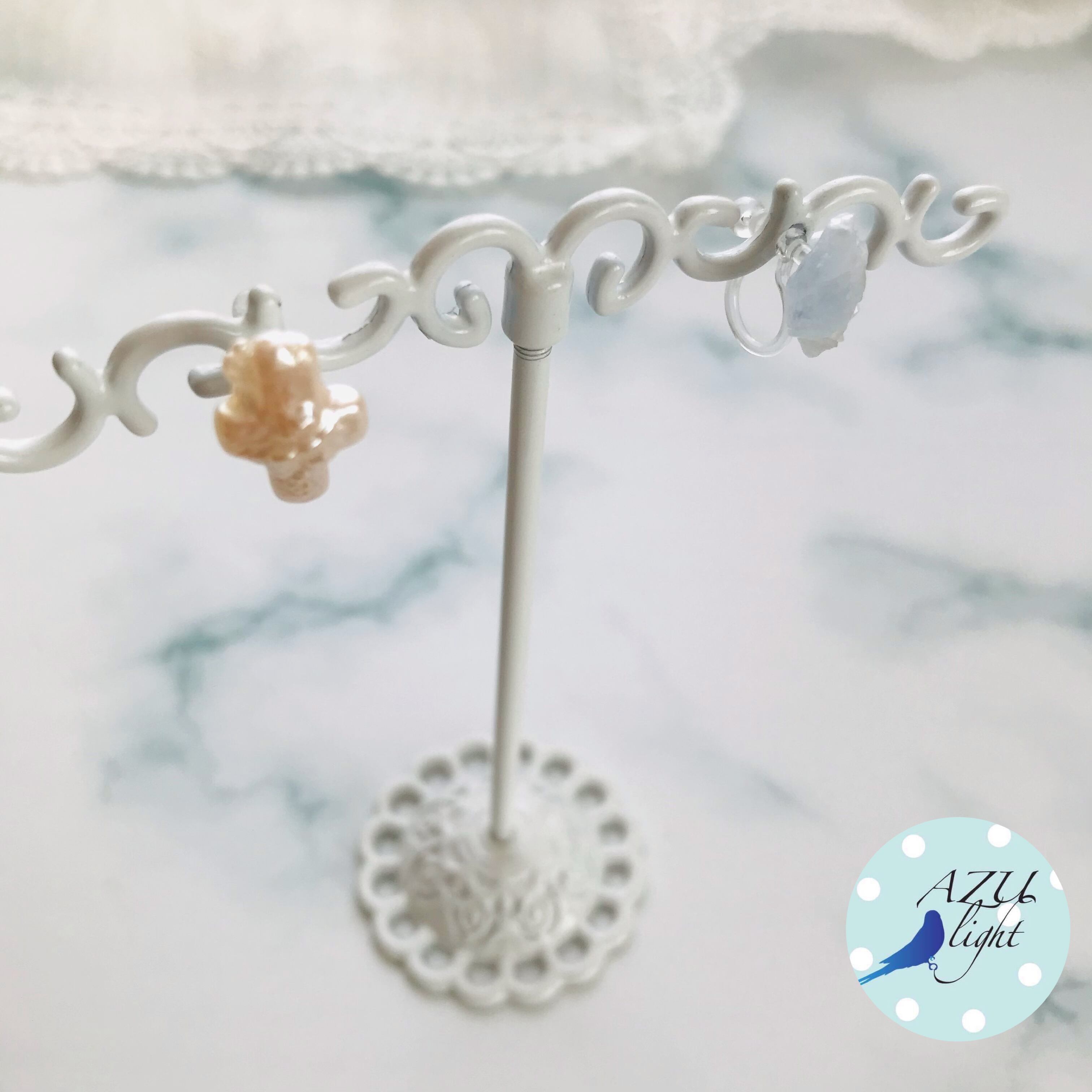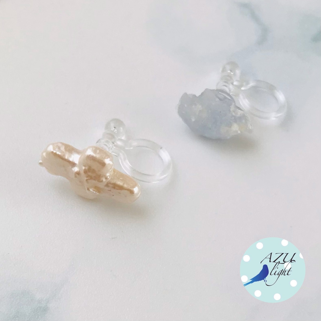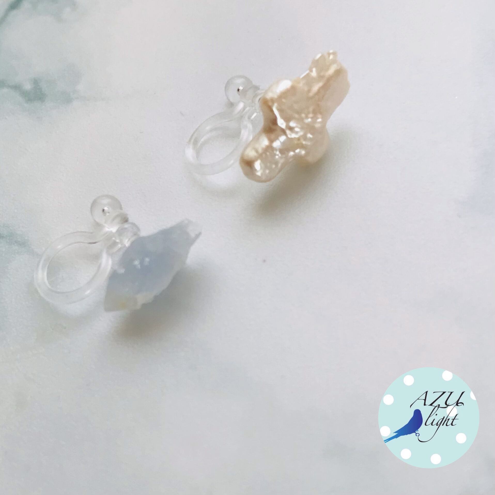 メキシコ産ブルーカルサイト原石(約11×7×4㎜)&クロス型ケシパール(約13×9×3㎜)&樹脂製ノンホールピアスを合わせた、フェミニンで個性的なアシンメトリーイヤリングです。