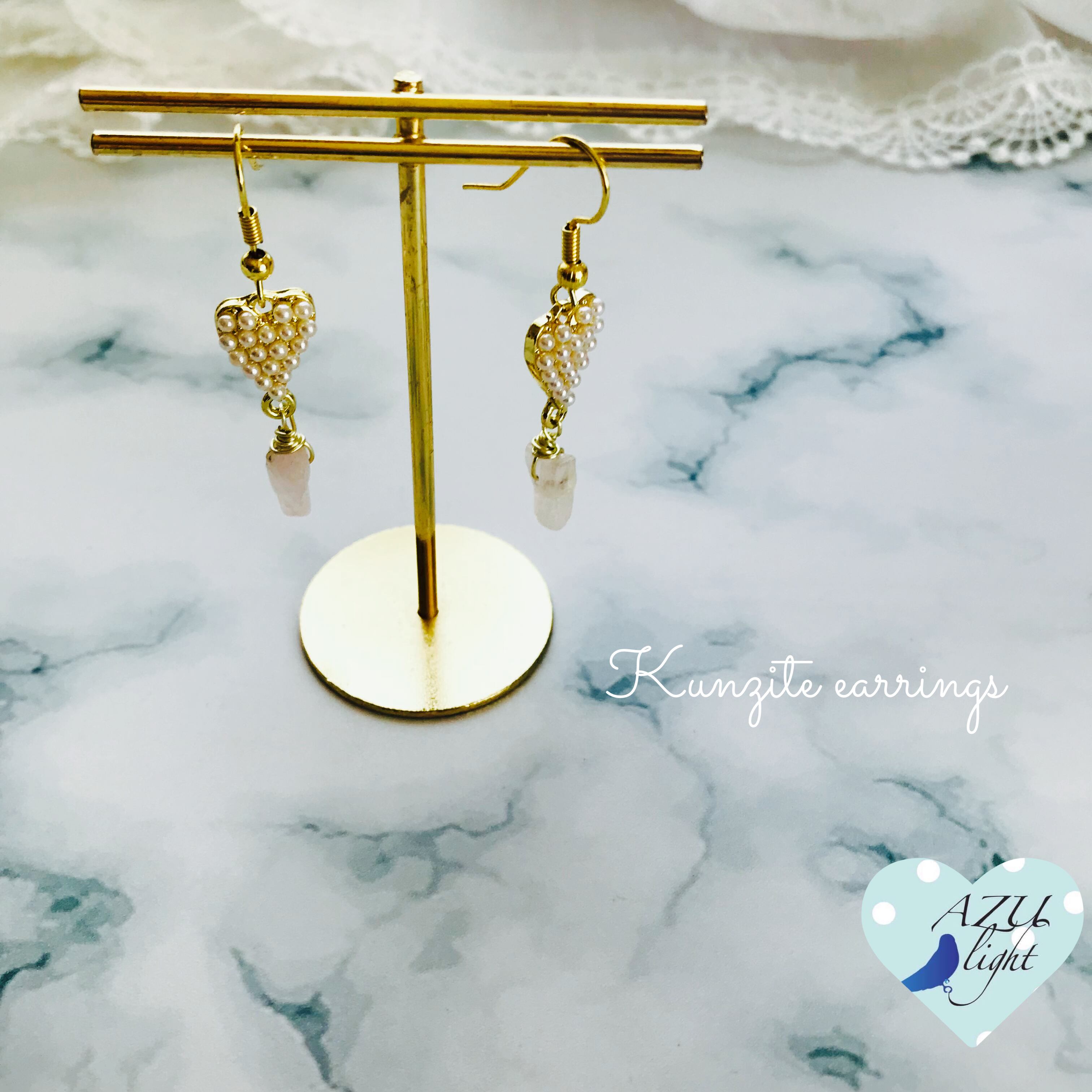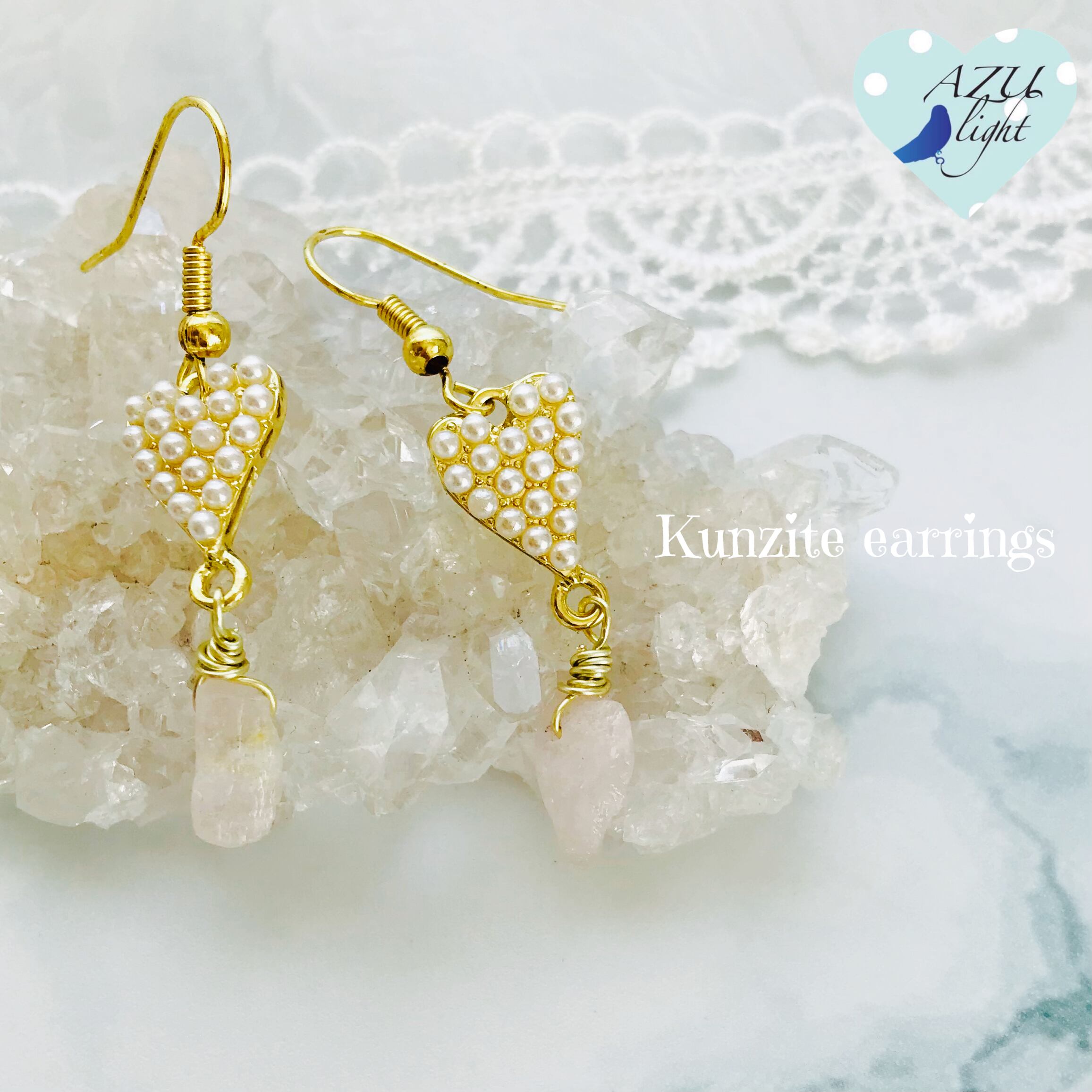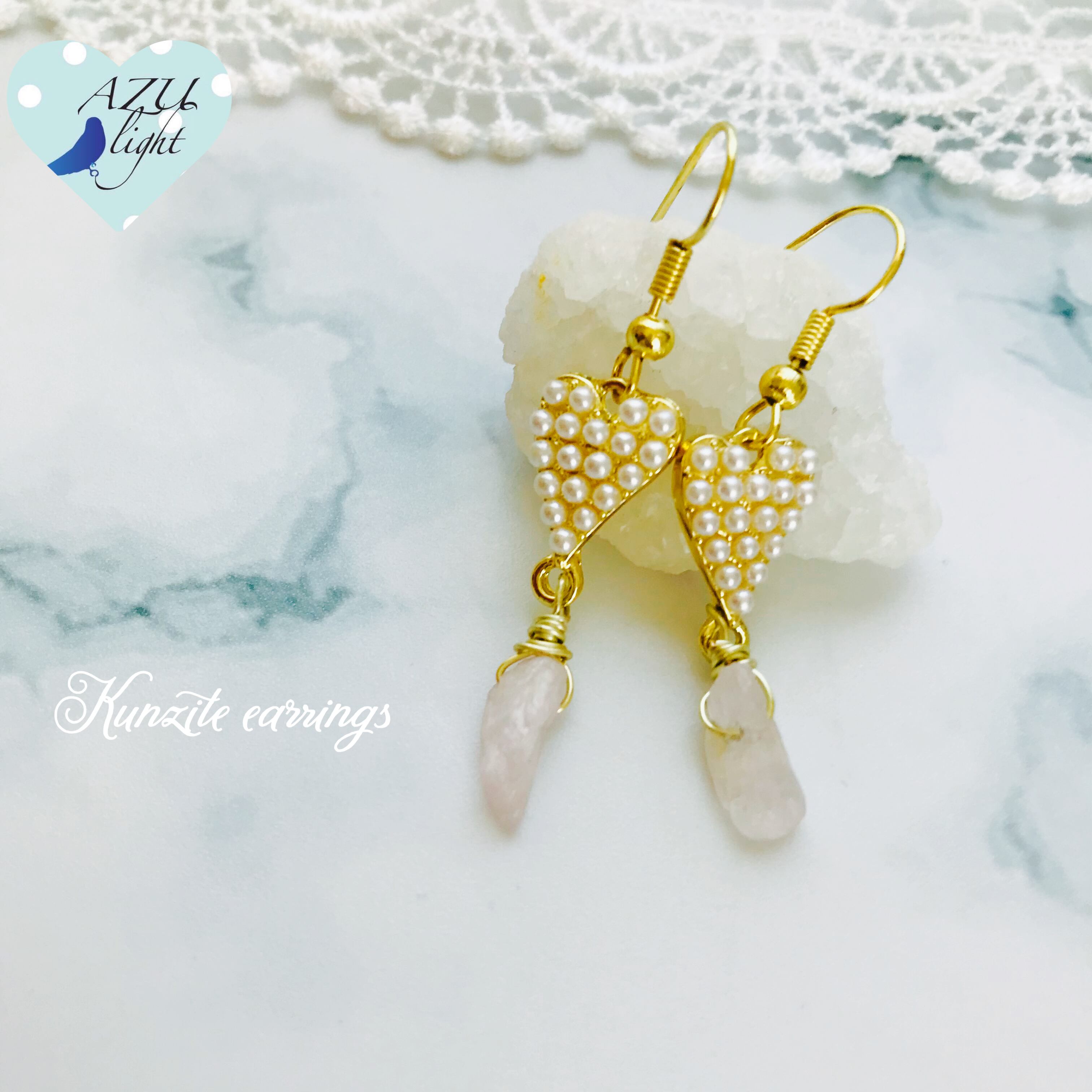 原石/アフガニスタン産【獅子座/天秤座/魚座/蟹座/牡羊座/牡牛座/射手座の守護石✴︎思春期の少女を癒す&若い母親やシングルマザーに力を与える✴︎成熟した大人の女性になる為のサポート✴︎慈悲の心を目覚めさせる✴︎人生のステージを上げる✴︎過去の恋愛や失恋の傷を癒す✴︎ストレスを和らげる✴︎鬱や重い病気の家族の世話をする方へ】クンツァイト×ハートパールモチーフのピアス