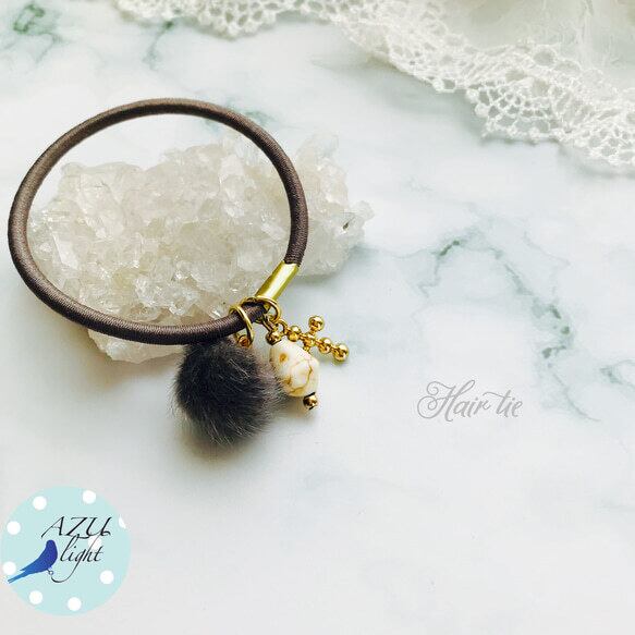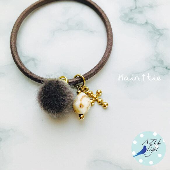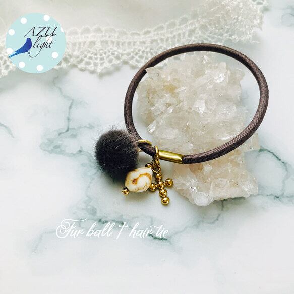 ハウライト(約12×10×8㎜)&クロスモチーフ&フェイクファーボール(直径/約15㎜)を合わせた、エレガントで大人カジュアルなヘアゴムです。