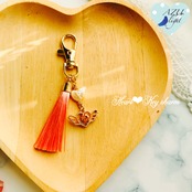 ハート型ケシパール(約12×11×4㎜)&ガラスビジュー付きハート+天使の羽モチーフ(23×12×5.5㎜)&サーモンピンク色のタッセル(長さ/5.3㎝)を合わせた、お子様から大人までお楽しみ頂けるキーホルダー/バッグチャームです。