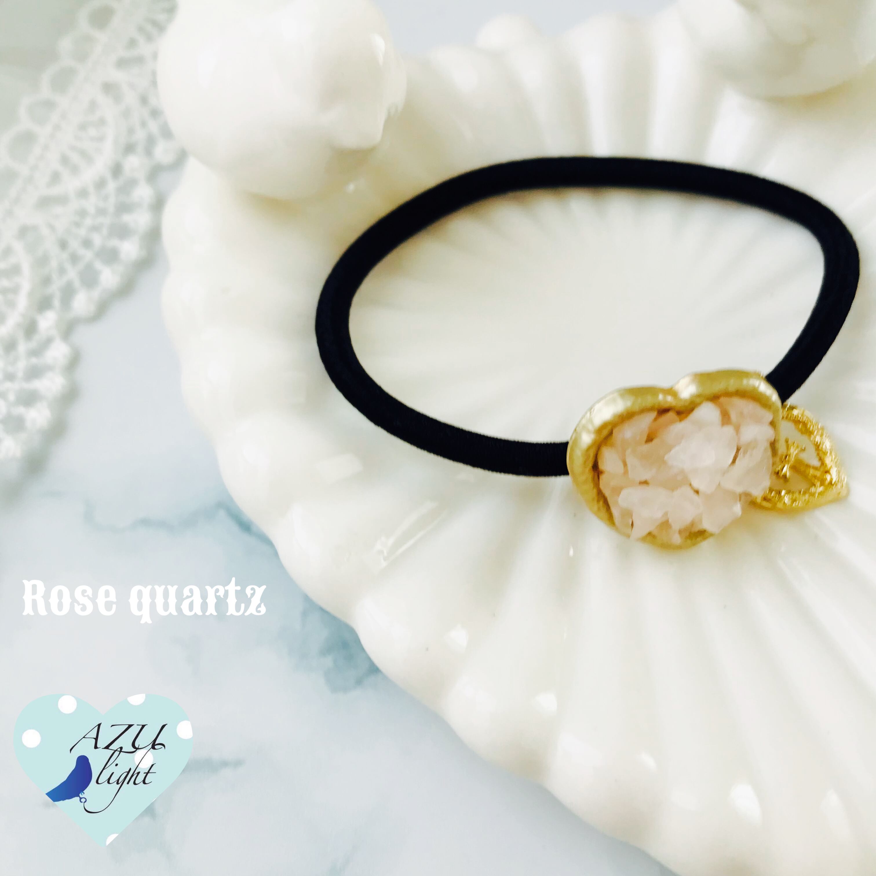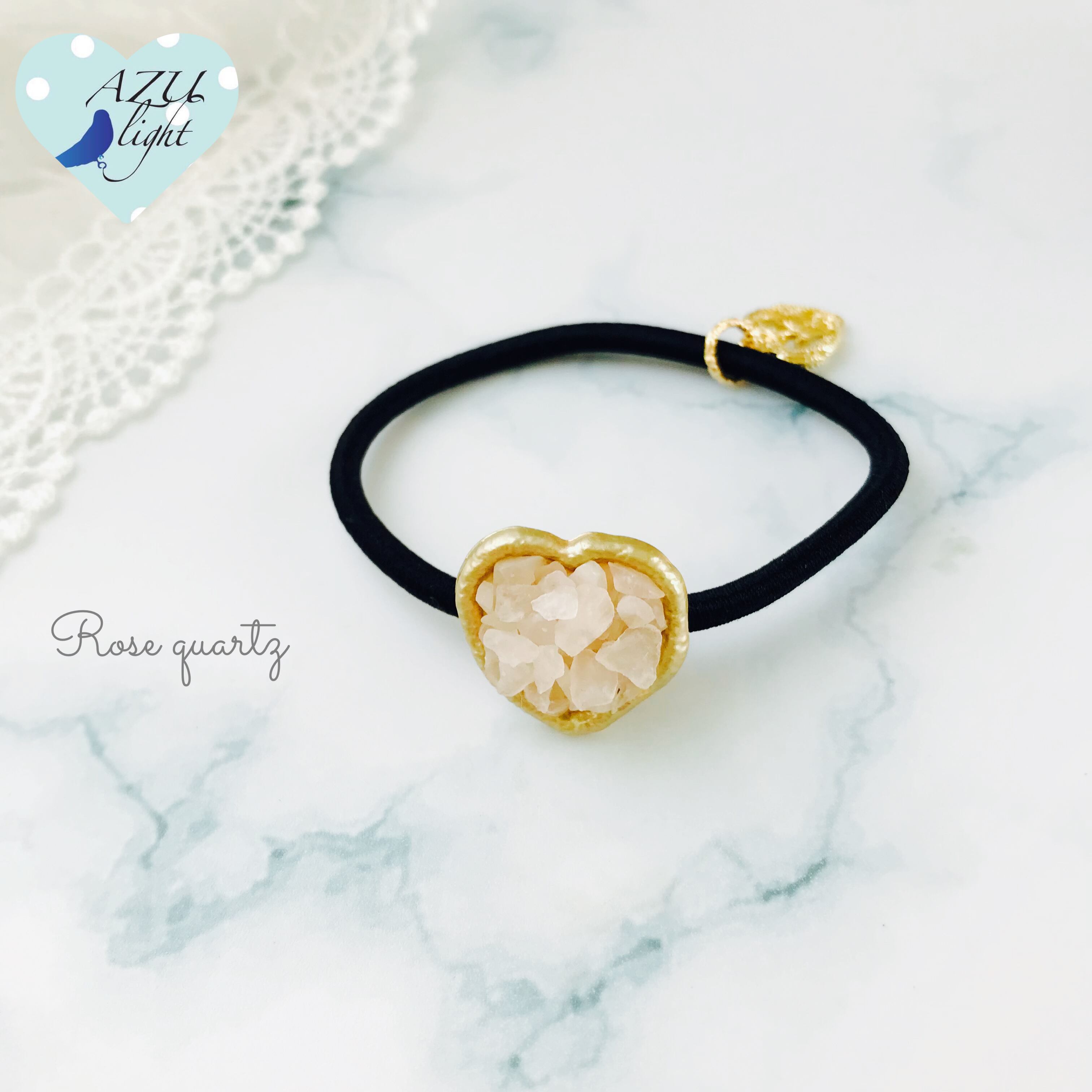 さざれ石のローズクォーツ&ハートクロスモチーフ(直径12㎜/マットゴールドカラー)&ハート型ヘアゴム台座(直径22㎜/マットゴールドカラー)を合わせた、エレガントで大人ガーリーなヘアゴムです。