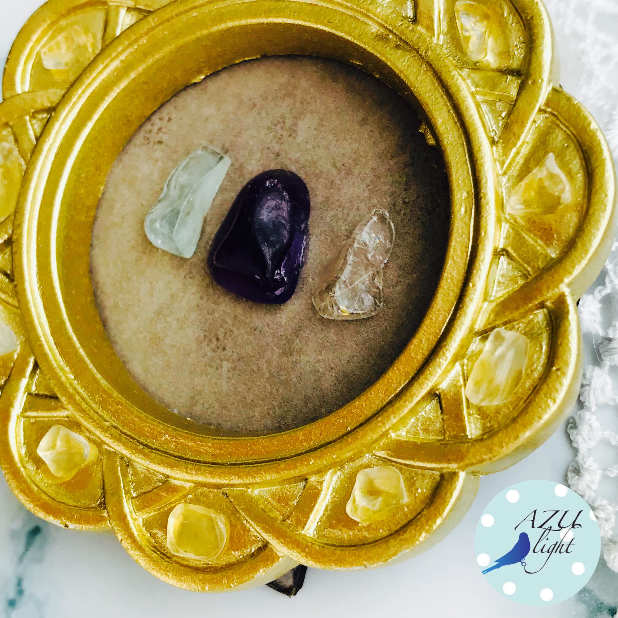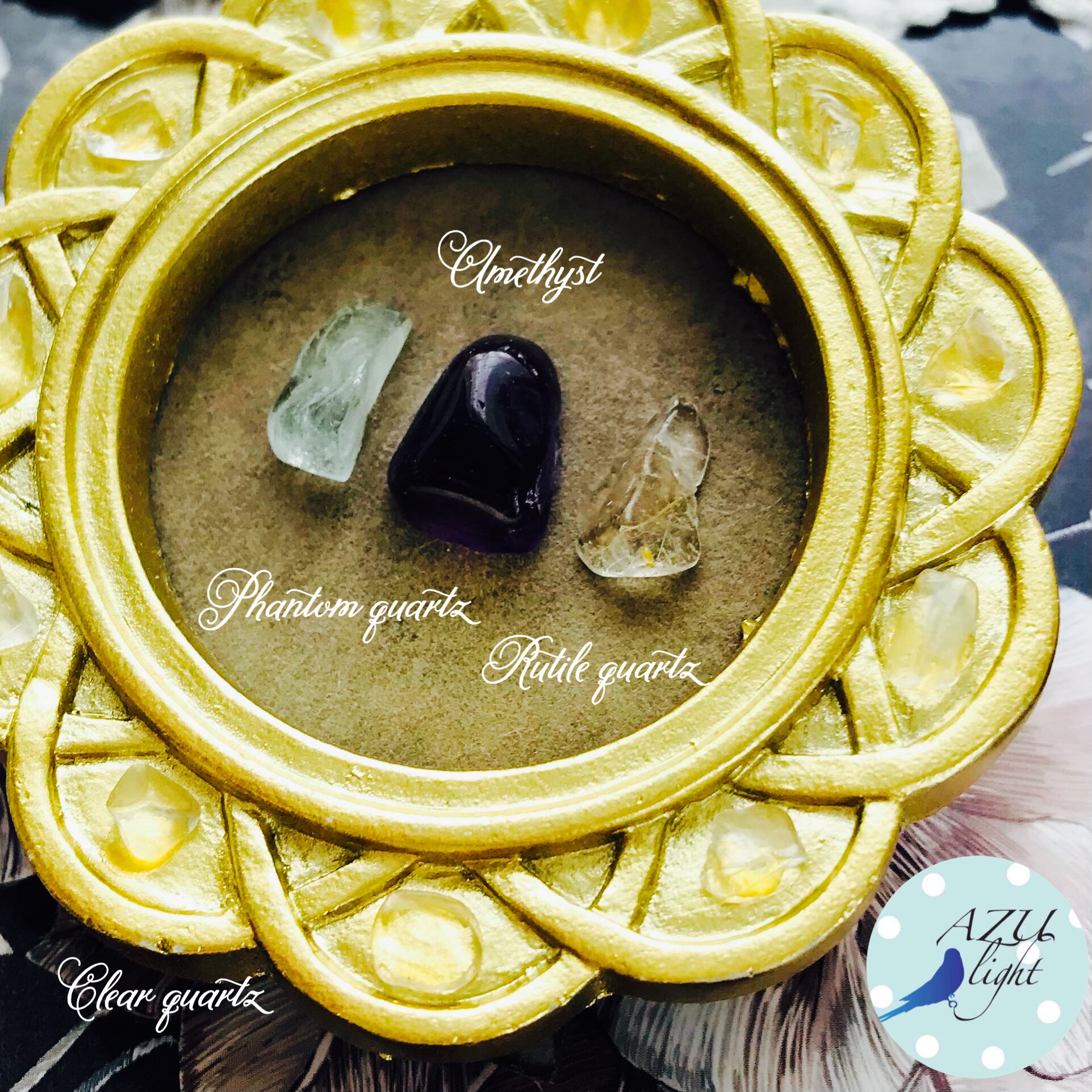 アメジスト(約14×10㎜)&グリーンファントムクォーツ(約12×5.5㎜/AA+)&ルチルクォーツ(約12.5×4〜7㎜/AA+)&さざれ石の水晶&マットゴールドカラーのフラワー(曼荼羅/幾何学)フレームを合わせた、ミニサイズの天然石アートオブジェです。