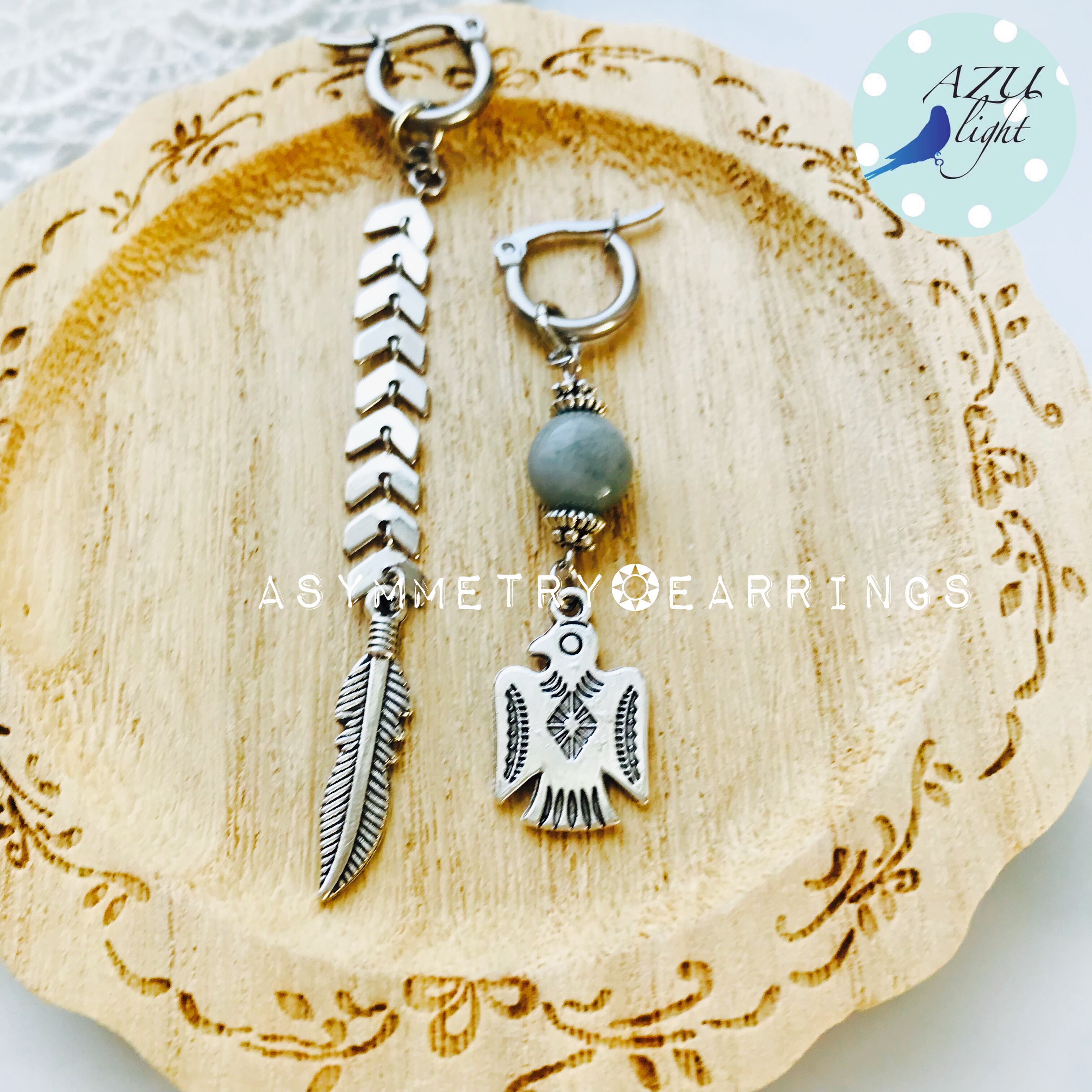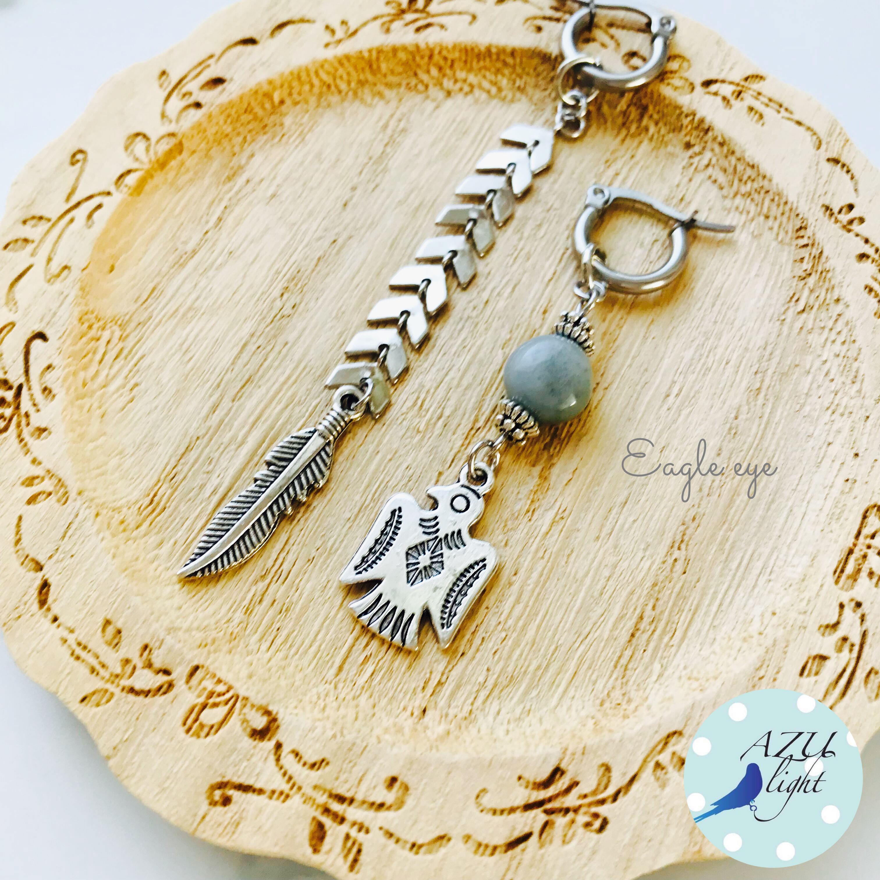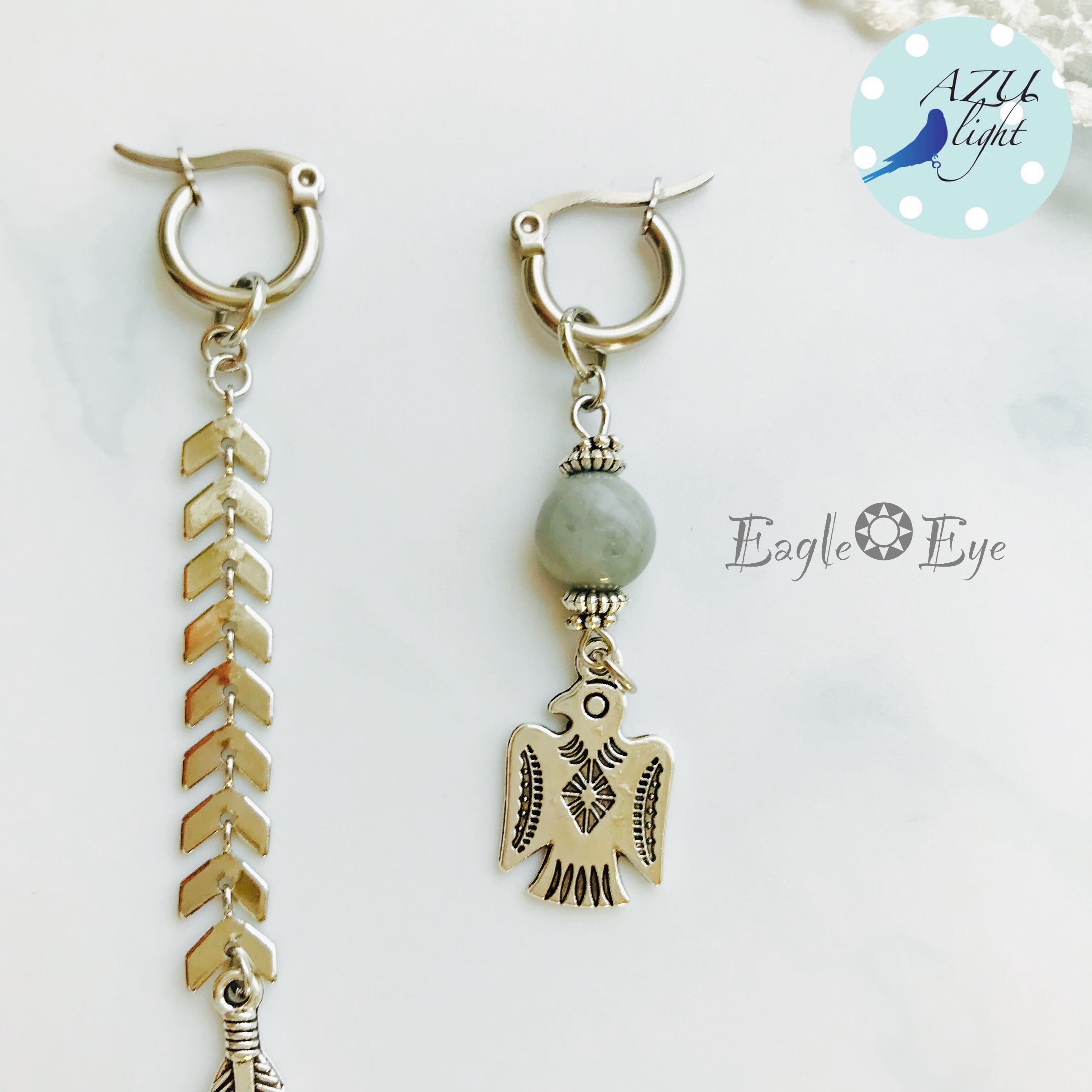 3way/BOHO【自然とスピリチュアリティ✴︎グラウンディング効果✴︎旅のお守り✴︎神の眼の石✴︎高い精神性と冷静な心を保つ✴︎自分自身を深く理解したい時に✴︎財力✴︎乙女座/射手座/水瓶座の守護石】イーグルアイ×サンダーバード×羽+フィッシュボーンのアシンメトリーピアス/チャーム/ペンダントトップ