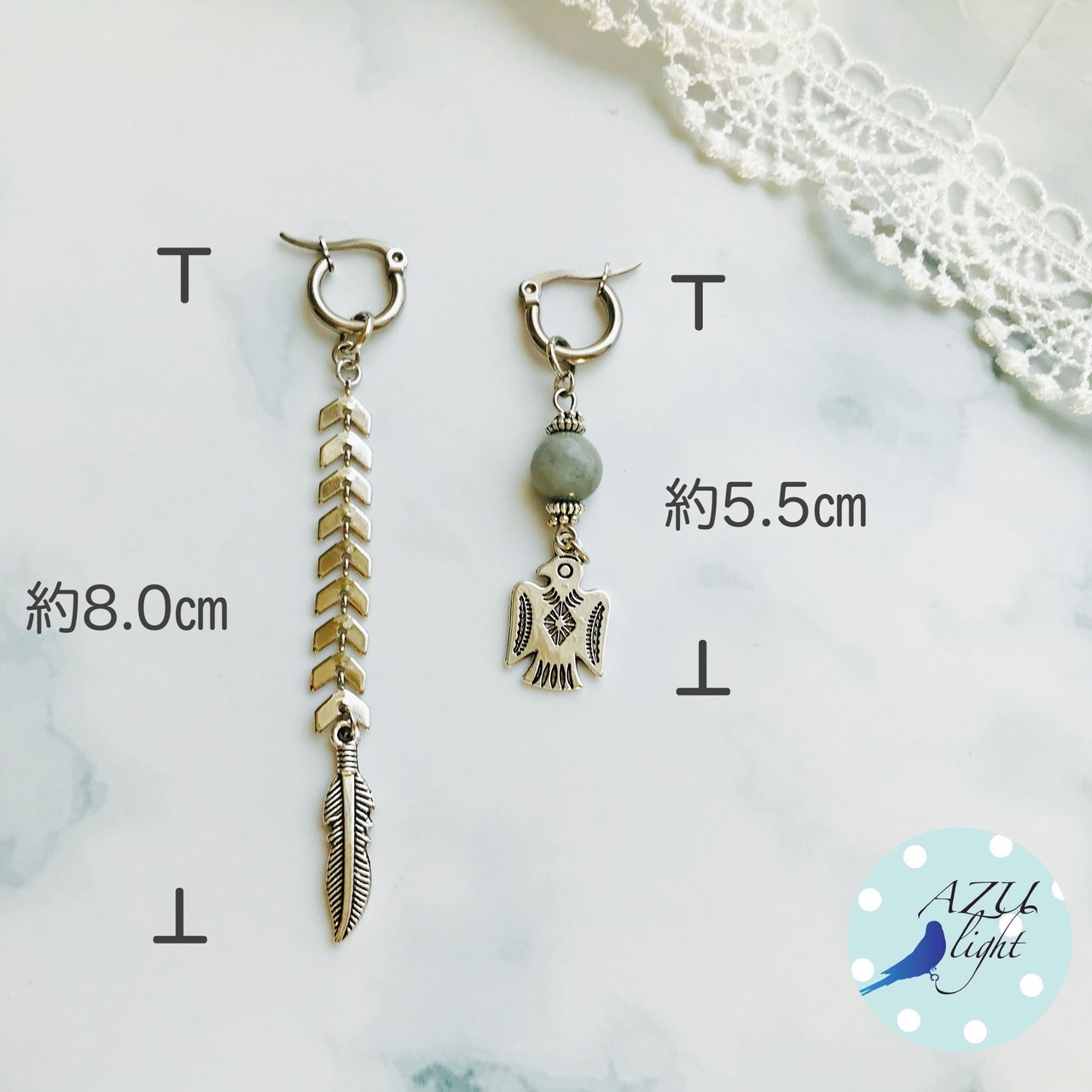 イーグルアイ(約9×9×6㎜)&サンダーバードモチーフ(12×19㎜/合金製)&フィッシュボーンチェーン(幅/6㎜)&羽モチーフ(24.5×5.5㎜/カドミウム&鉛フリー)&低刺激性フープピアス(12×2㎜/304ステンレススチール製)を合わせた、カジュアルな3wayアシンメトリーピアスです。