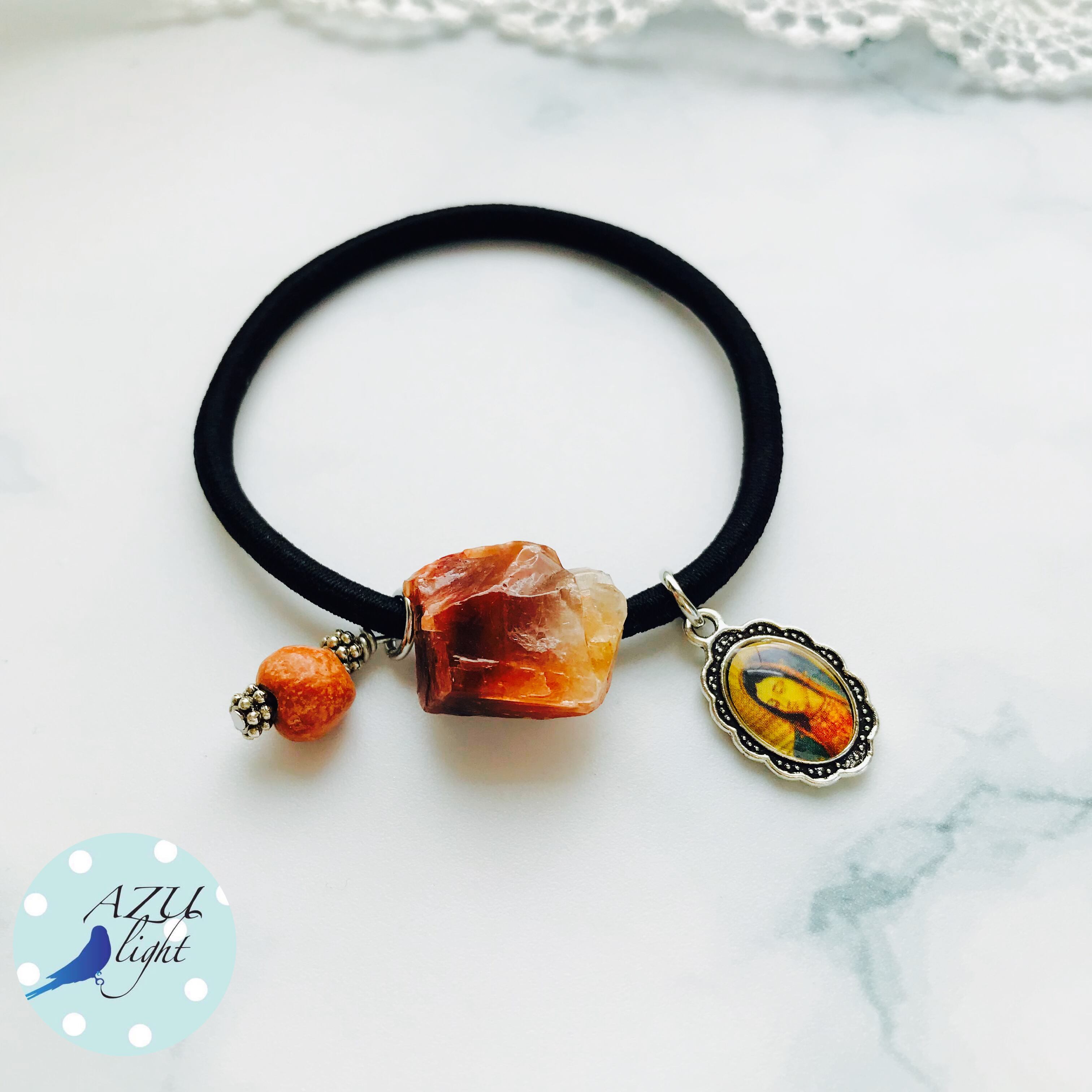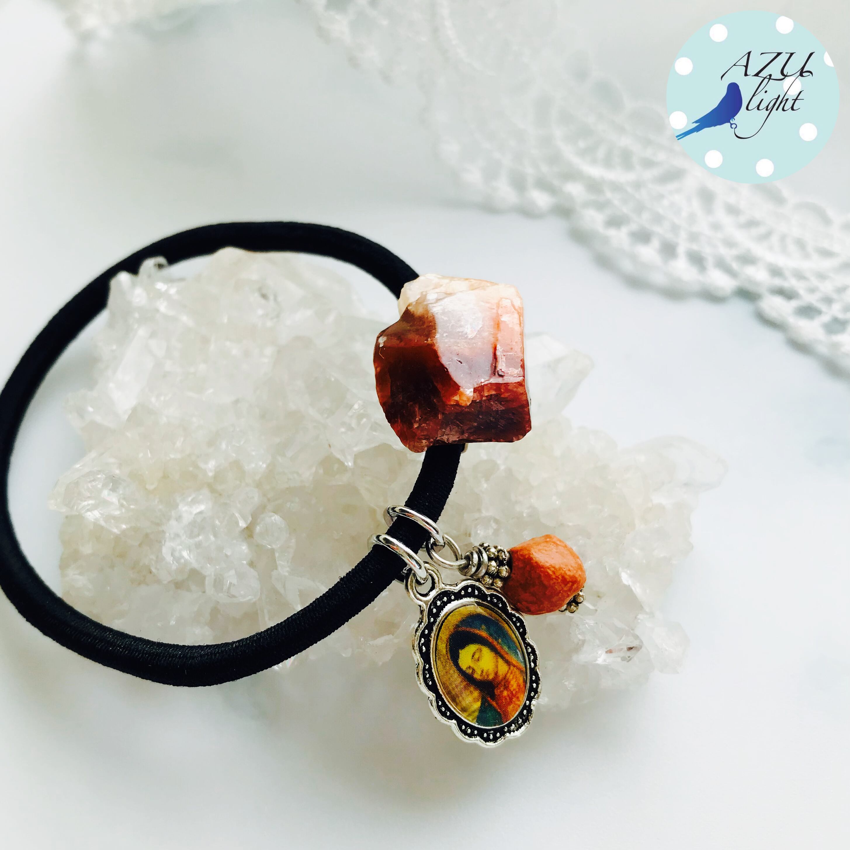 メキシコ産レッドカルサイト(約16×14×5㎜)&メキシコ産テラコッタ/陶器ビーズ(約7㎜玉)&聖母マリアメダイ(12×16㎜)を合わせた、大人カジュアルなヘアゴムです。