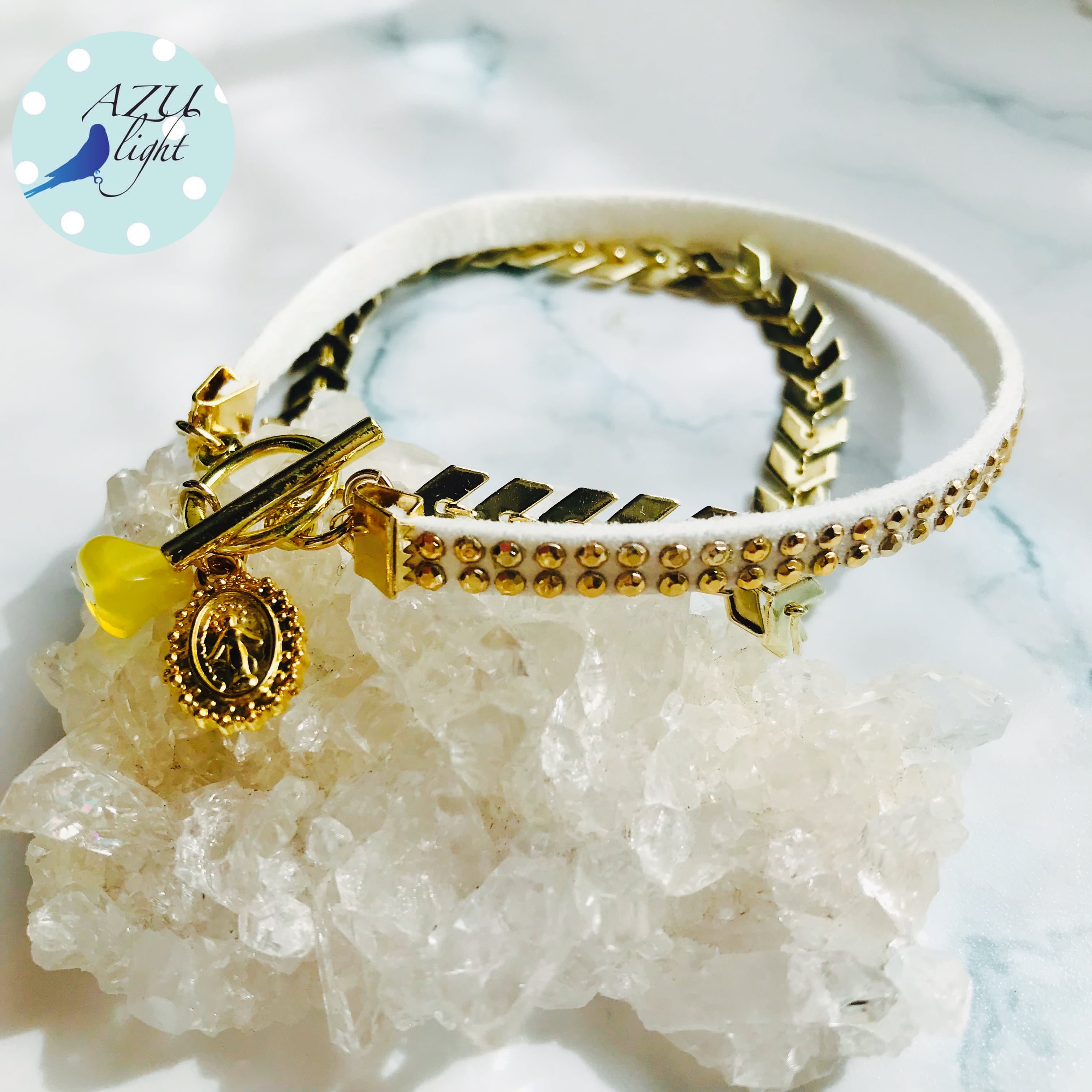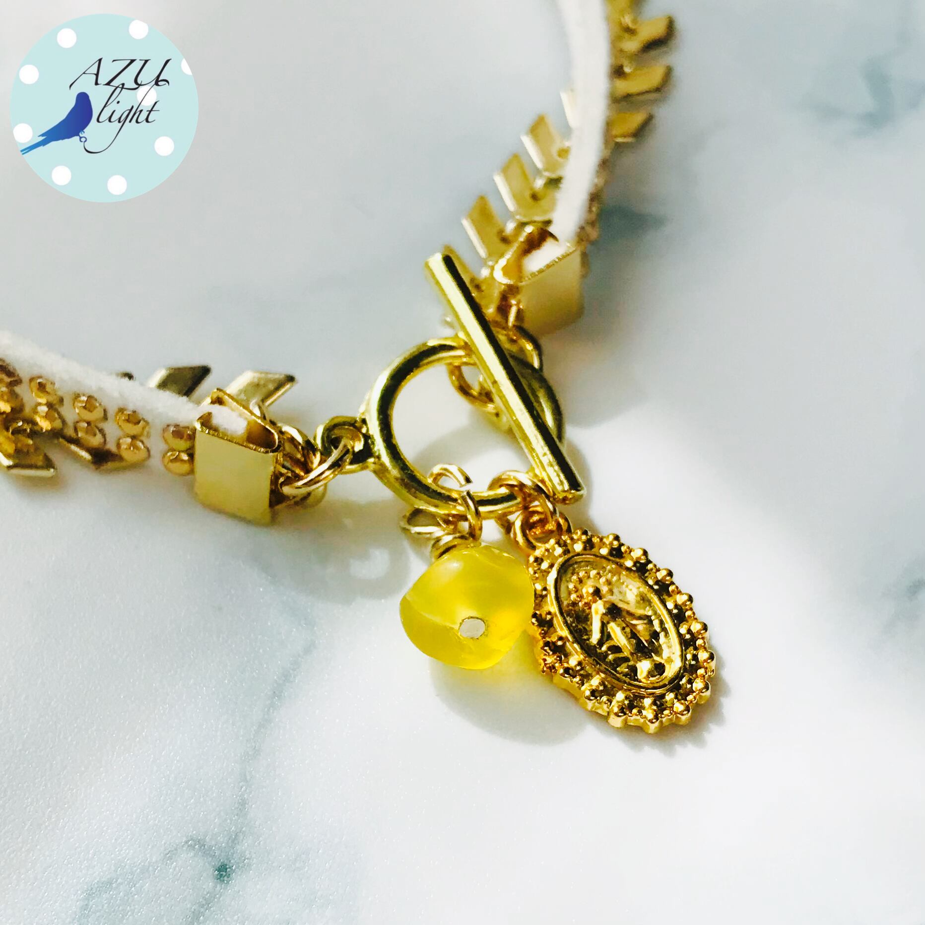 イエローオパール(約6×6.5×7㎜))& メダイ(18KGP/11×9㎜)&フィッシュボーンチェーン(ライトゴールドカラー/幅6㎜)&スタッズ付きフェイクスエード(幅5㎜)を合わせた、大人カジュアルな2連マンテルブレスレットです。
