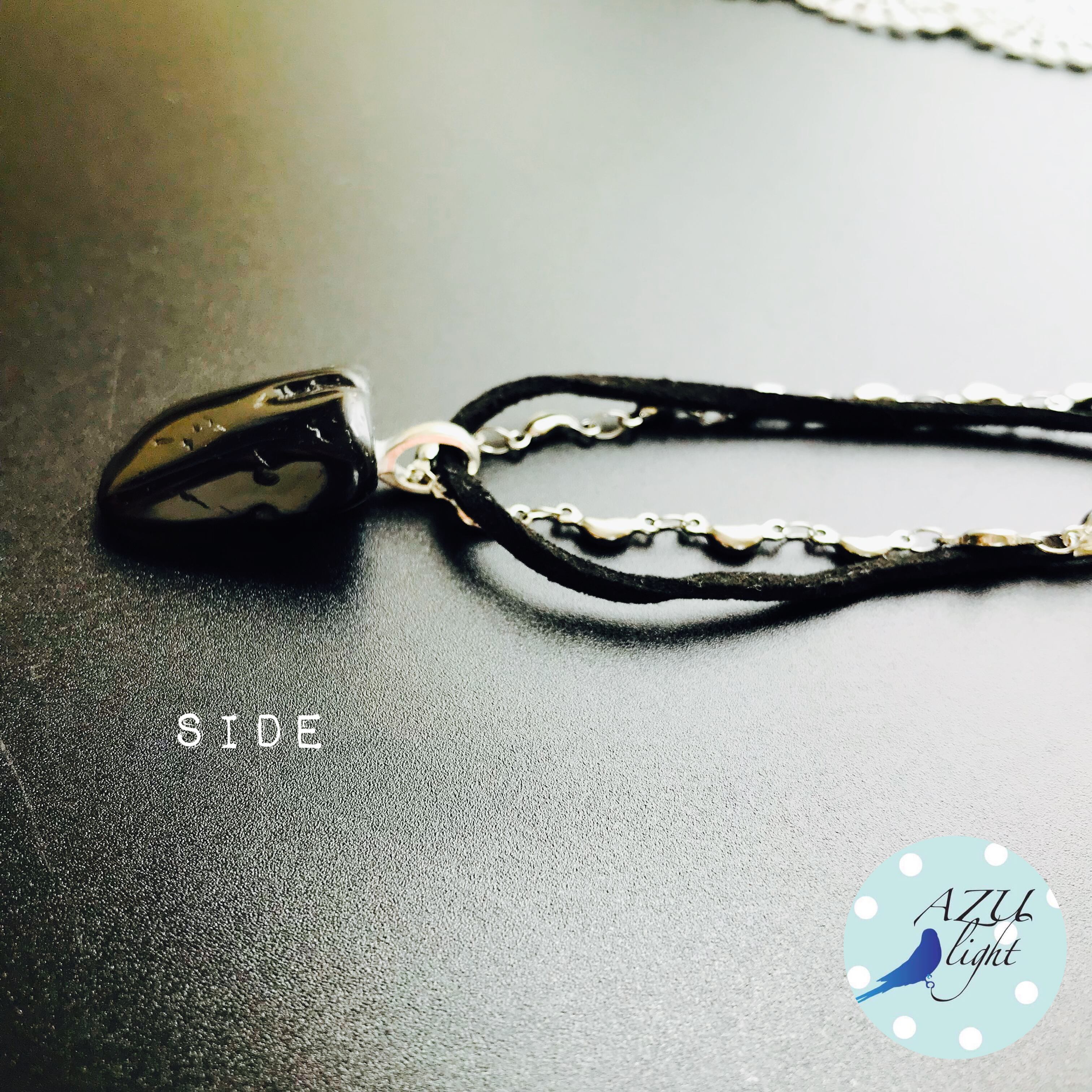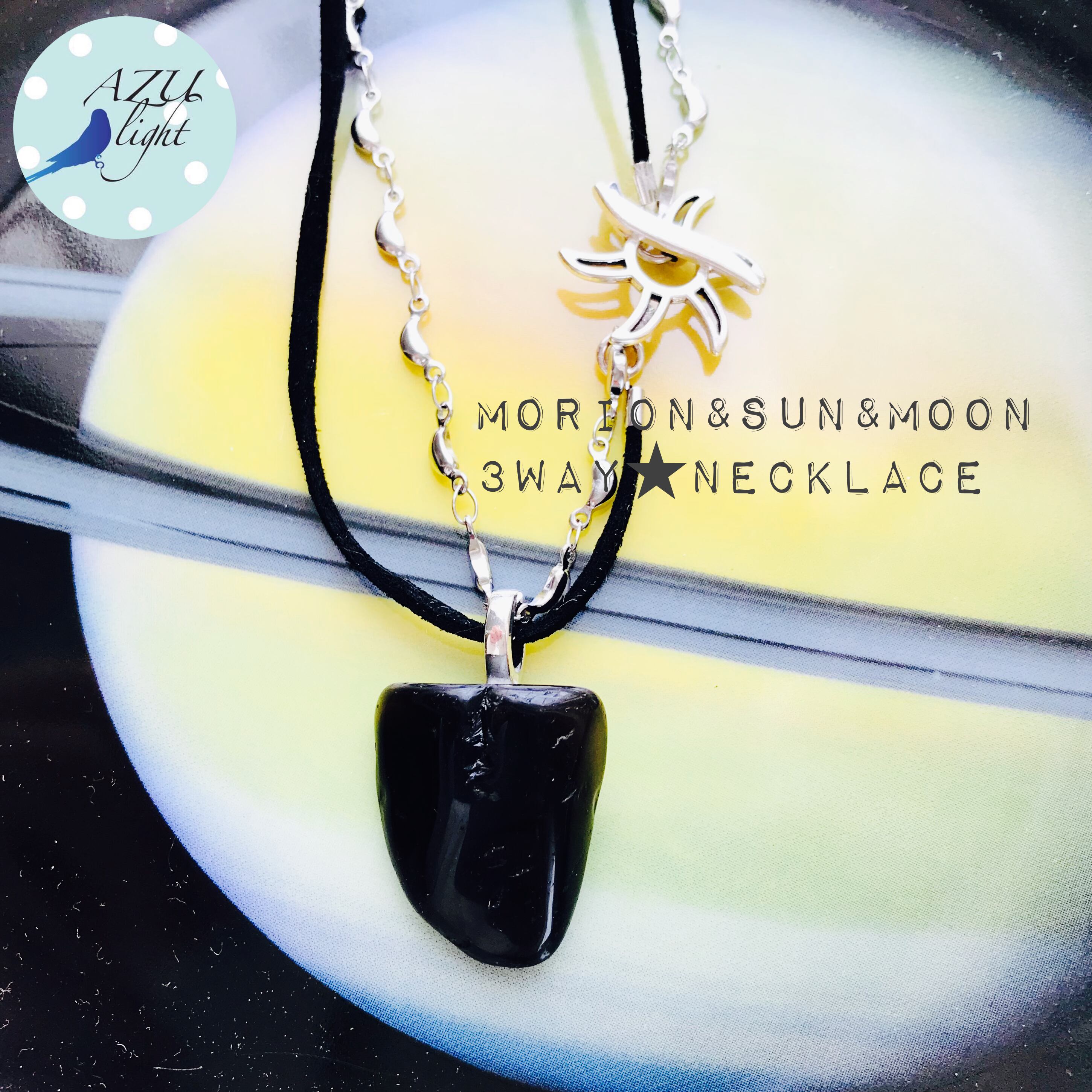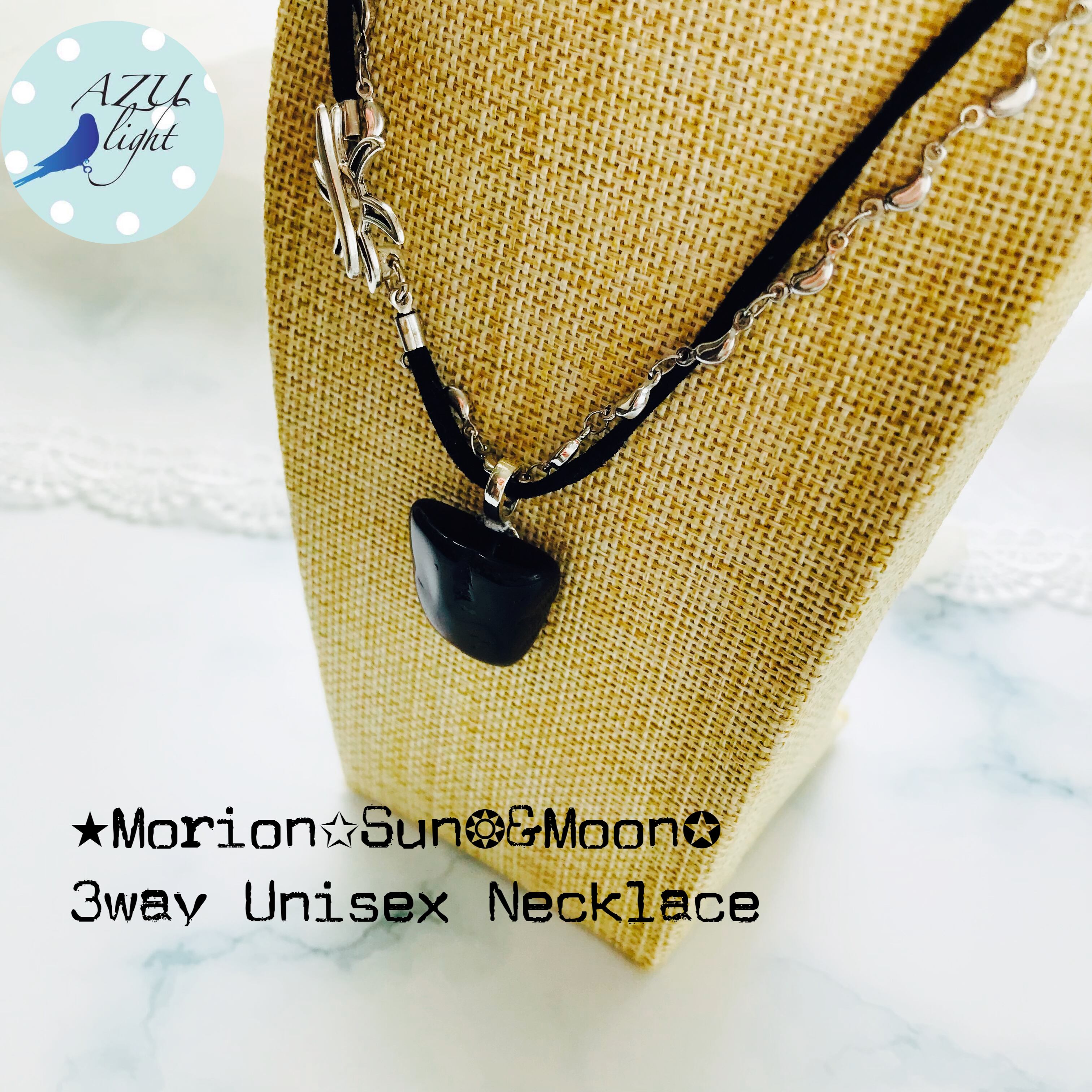 モリオン/黒水晶(約2.5×2.2×7㎜)& 三日月チェーン(幅4㎜/ステンレススチール製)&フェイクスエード(幅2.5㎜/ブラックカラー)&太陽マンテル(直径22㎜/カドミウム&鉛フリー)を合わせた、ユニセックスデザインの3wayネックレスです。