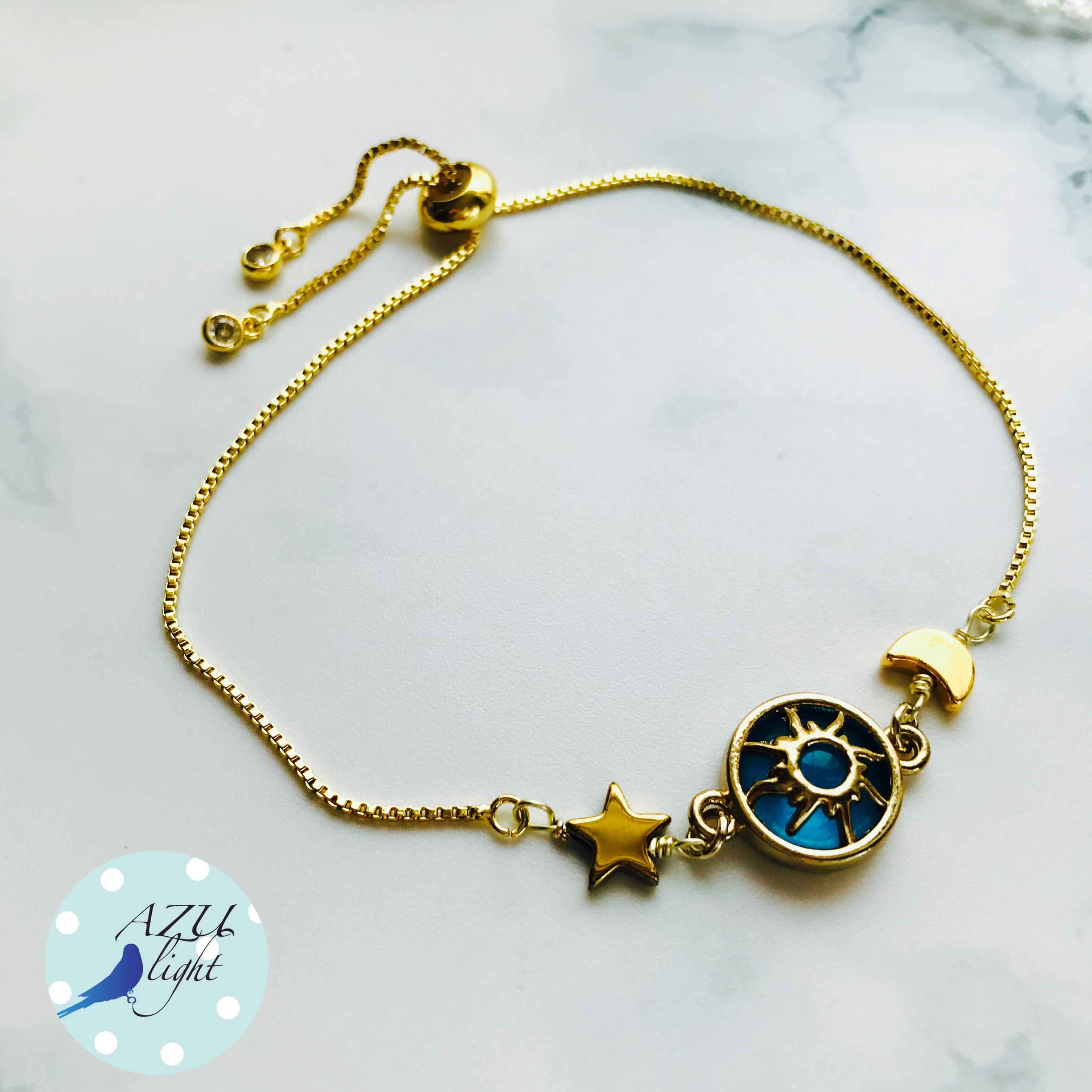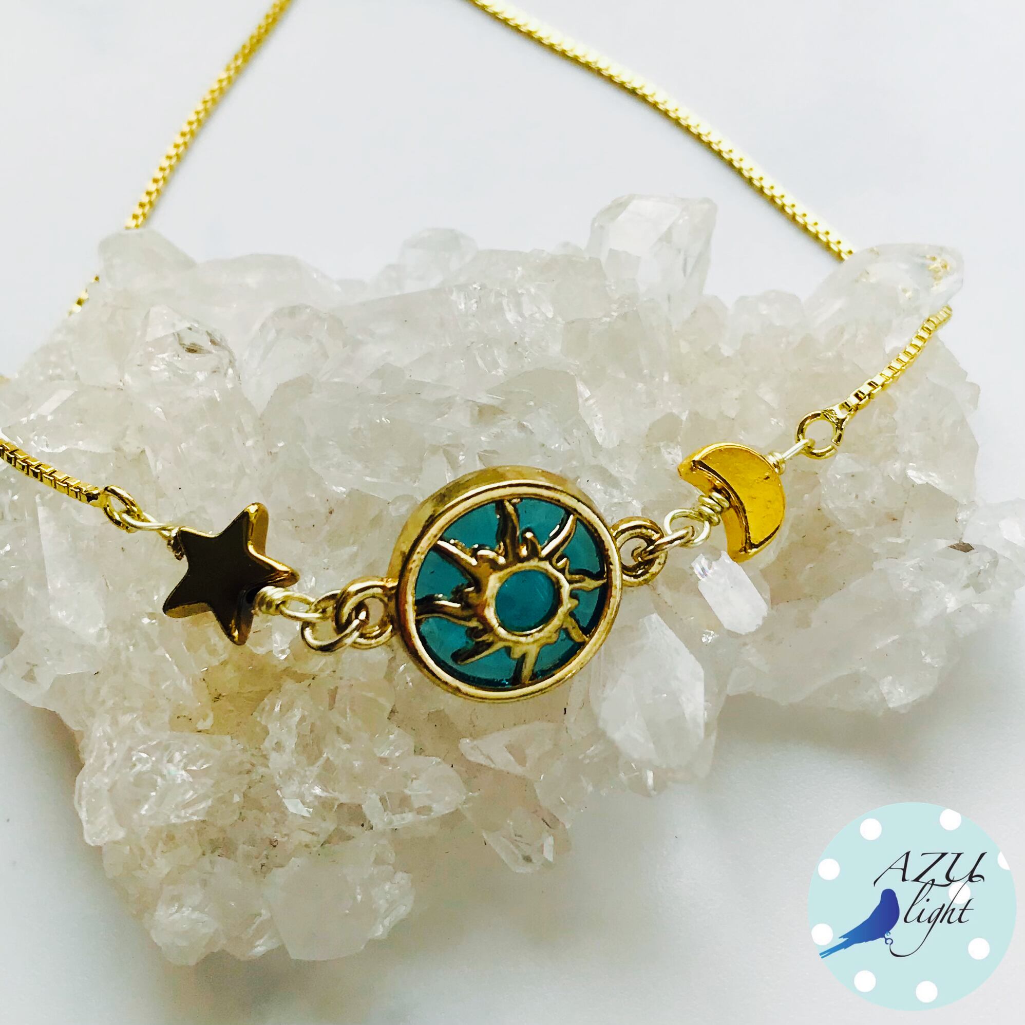 星型ヘマタイト(8×8×2㎜)&太陽モチーフ(直径13.5㎜/メッキ合金+ガラス製)&三日月型メタルビーズ(7×5×2.5㎜)&真鍮ベネチアンチェーンスライダーブレスレット(キュービックジルコニア付き/18KGP本金メッキ)を合わせた、大人カジュアルなフリーサイズブレスレットです。