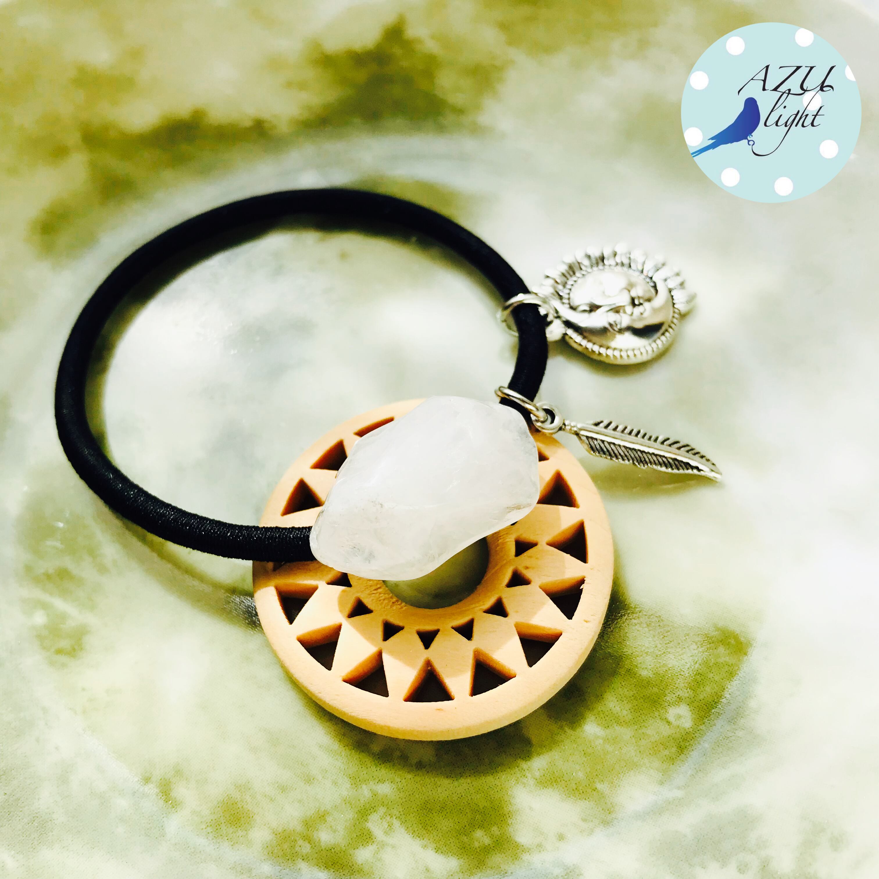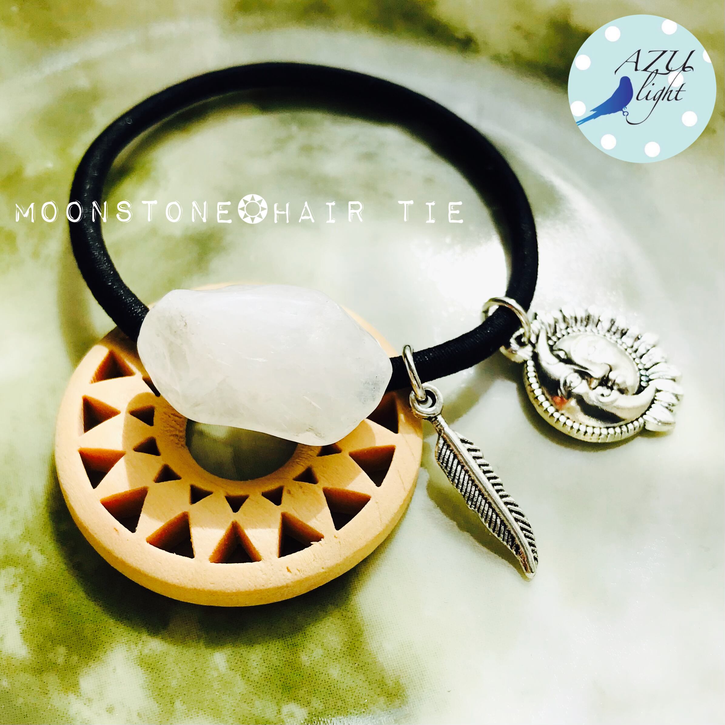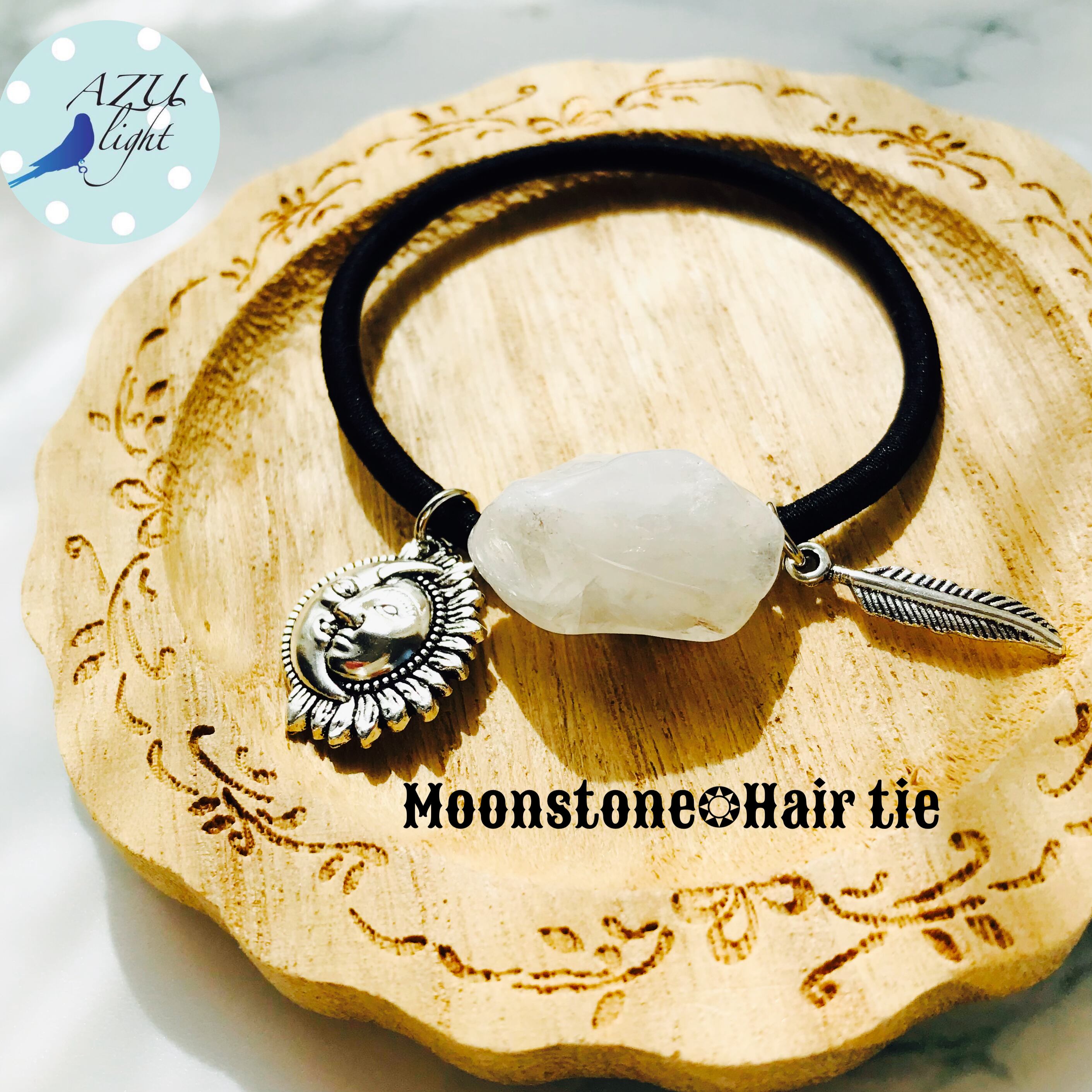 ムーンストーン(約24×14×6〜11㎜)&太陽と月モチーフ(直径16㎜/鉛&カドミウムフリー)& フェザーモチーフ(21×4.5㎜/カドミウム&鉛フリー)を合わせた、ボヘミアンカジュアルなヘアゴムです。