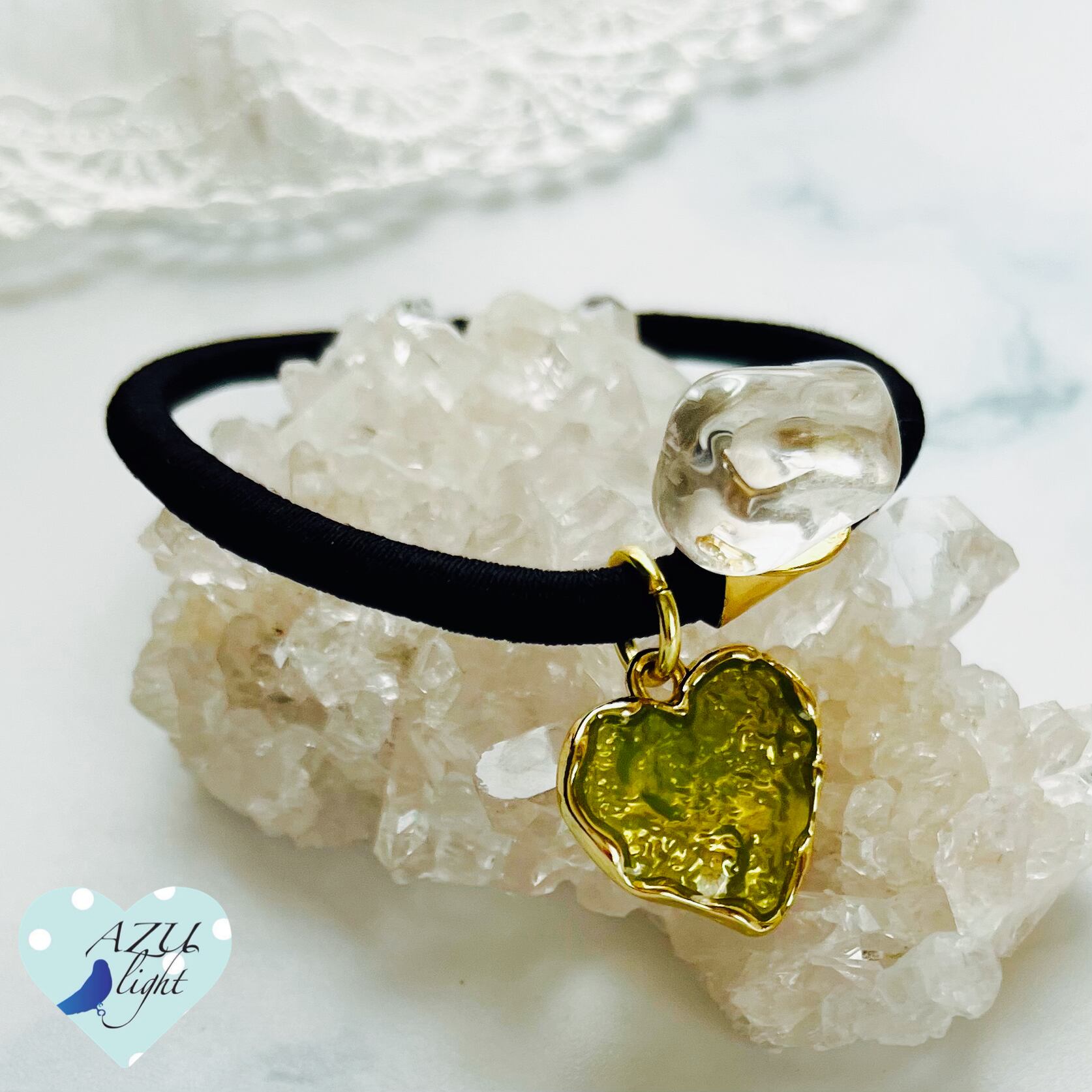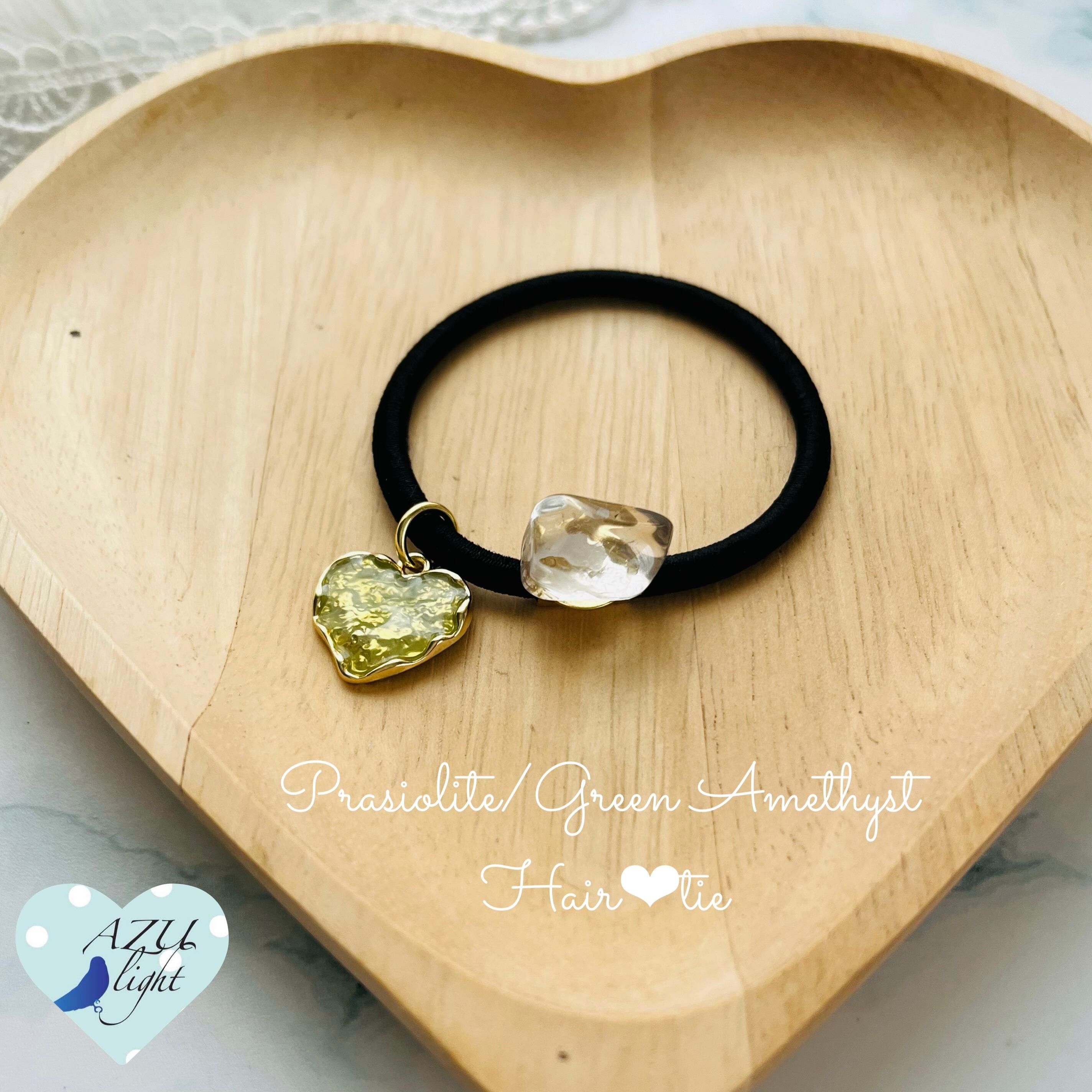 プラシオライト/グリーンアメジスト(約11×15×9㎜)&ハートモチーフ(18×17×2㎜/エポキシ樹脂製)を合わせた、大人可愛いヘアゴムです。