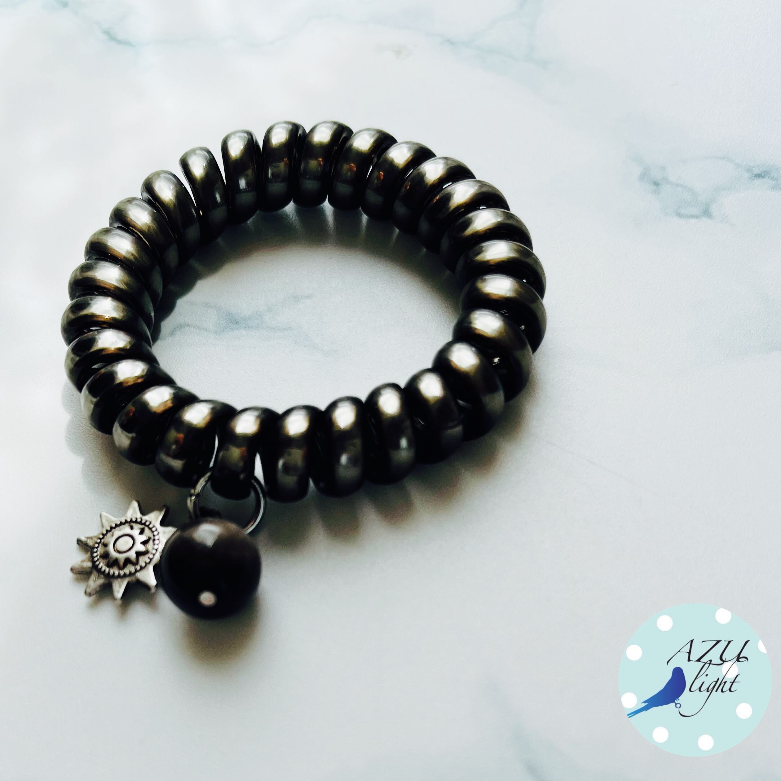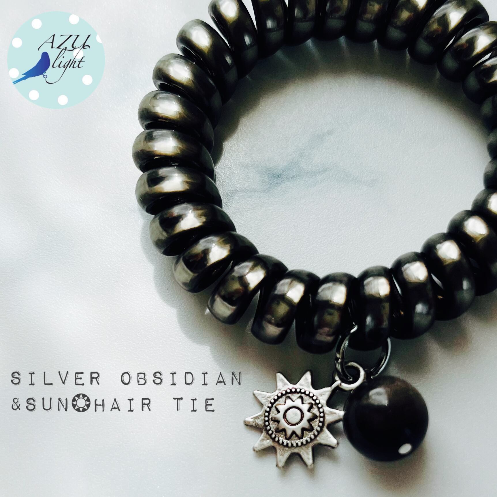 メキシコ産シルバーオブシディアン(10㎜玉/AAA)&太陽モチーフ(両面同柄/直径12.5㎜/ 鉛&ニッケル&カドミウムフリー /タイ産スターリングシルバー/925シルバーメッキ製)&メタリックカラーのスプリングゴム(PTU素材/ウレタン樹脂製)を合わせた、大人カジュアルなヘアゴムです。