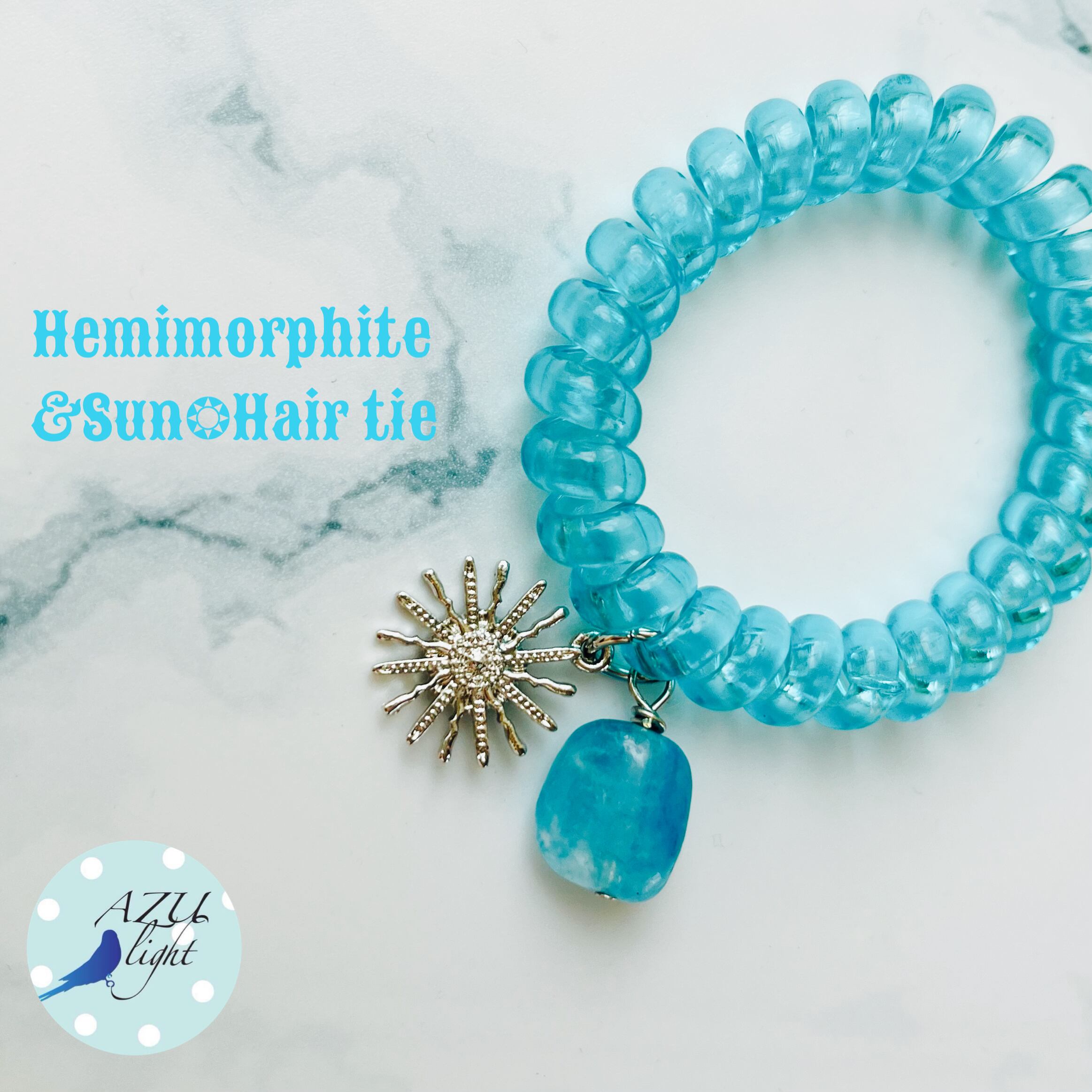 ヘミモルファイト(約12×13×8㎜)&太陽モチーフ(直径17㎜)&スプリングポニー(ポリエチレン素材)を合わせた、カジュアルなスプリングヘアゴムです。