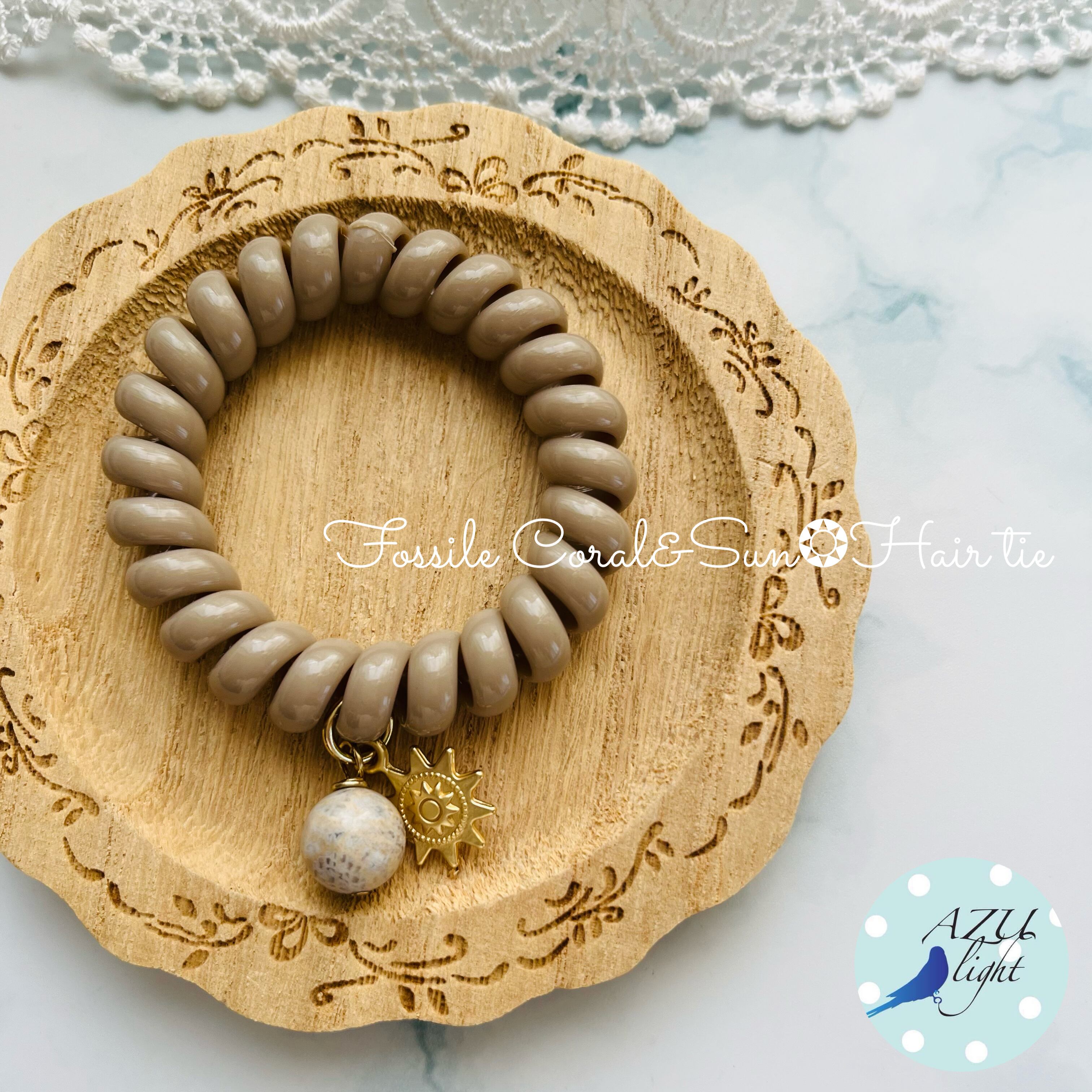 BOHO/インドネシア産【蟹座/牡牛座の守護石✴︎あらゆる依存やネガティブな感情を克服させる✴︎トラブル回避&災いから守る✴︎想像力を高め、未来への見通しを明確化させる✴︎人生を変えつつ、大切なものを保つ✴︎難しい状況でも気楽さを与える✴︎3月誕生石】フォシルコーラル×18KGP太陽モチーフのスプリングヘアゴム