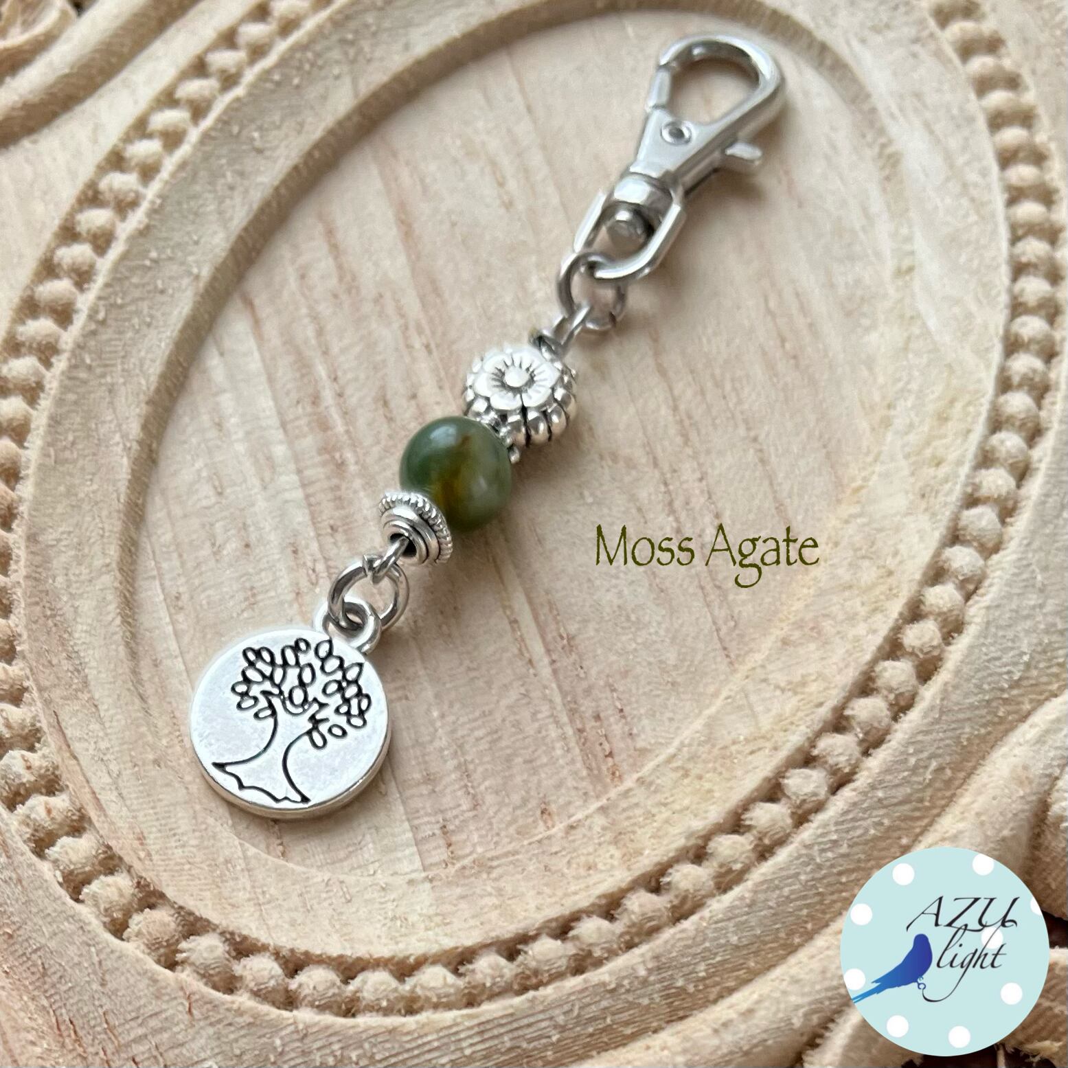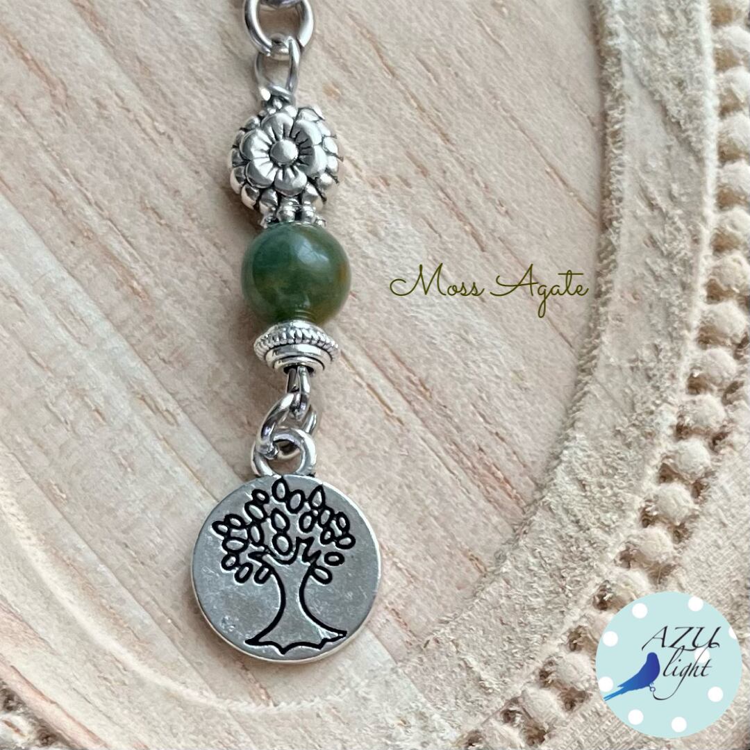 【乙女座/牡牛座/蟹座の守護石✴︎豊作や繁栄をもたらす農業の守り神✴︎植物のようなヒーリング効果やリラックス作用&健康な心と身体を取り戻させる✴︎物質界におけるバランスと安定をもたらす✴︎自分独自のリズムを思い出させる✴︎病後の回復期の方や、依存症の立ち直り期の方へ✴︎繁栄をもたらしお金の流出を防ぐ✴︎新たな始まりや目標へ導く&成長や再成長✴︎ネガティブなカルマを手放すサポート】モスアゲート×生命の樹モチーフ×フラワービーズのチャーム/キーホルダー