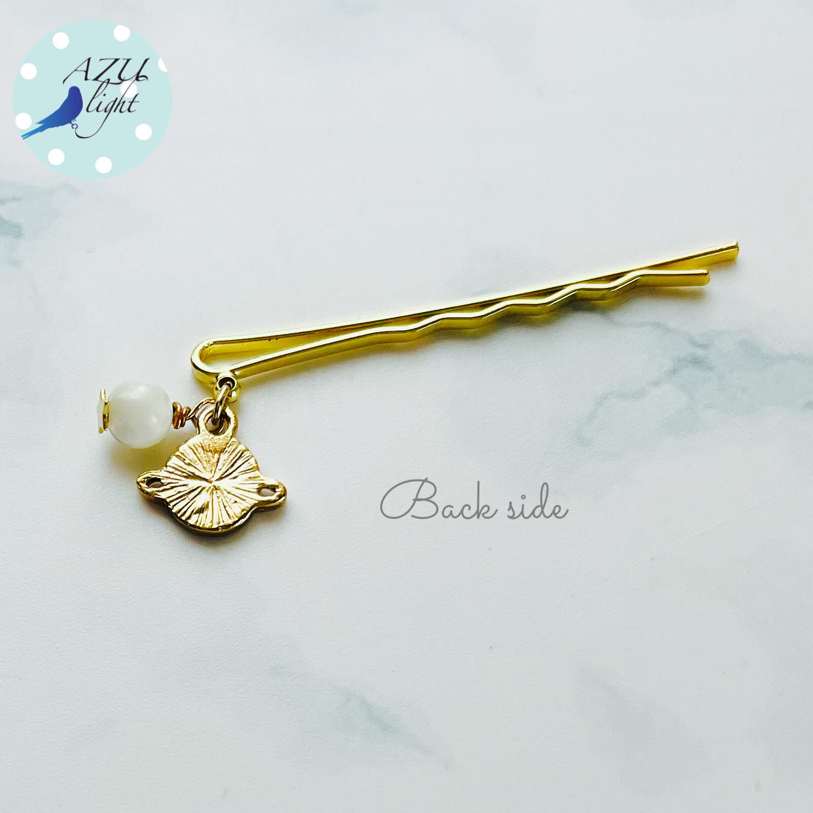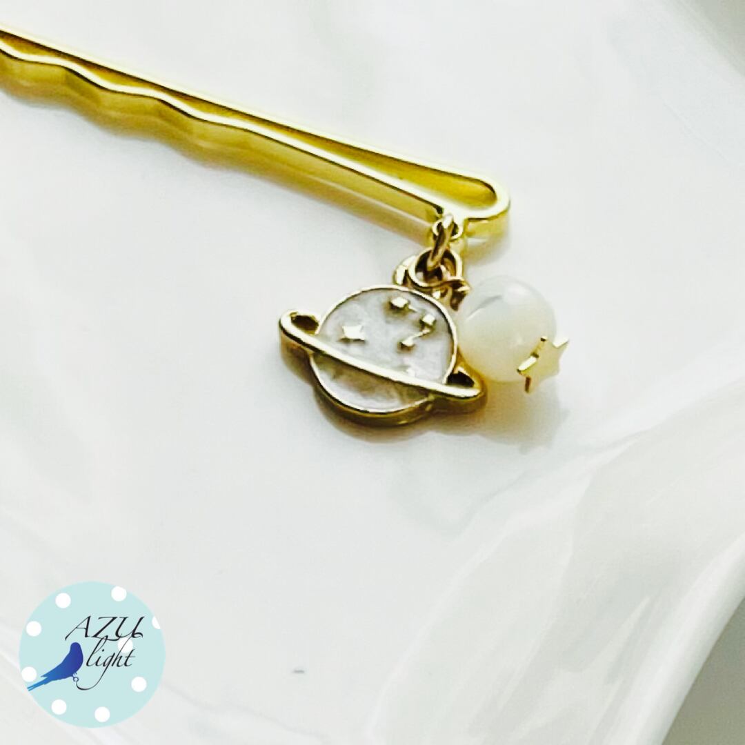 マザーオブパール(約6.5〜7㎜玉)&ホワイトカラーの土星/惑星モチーフ(エナメル+合金製/約13×14.5×2㎜)を合わせた、お子様から大人までお使い頂ける、カジュアルなヘアピンです。