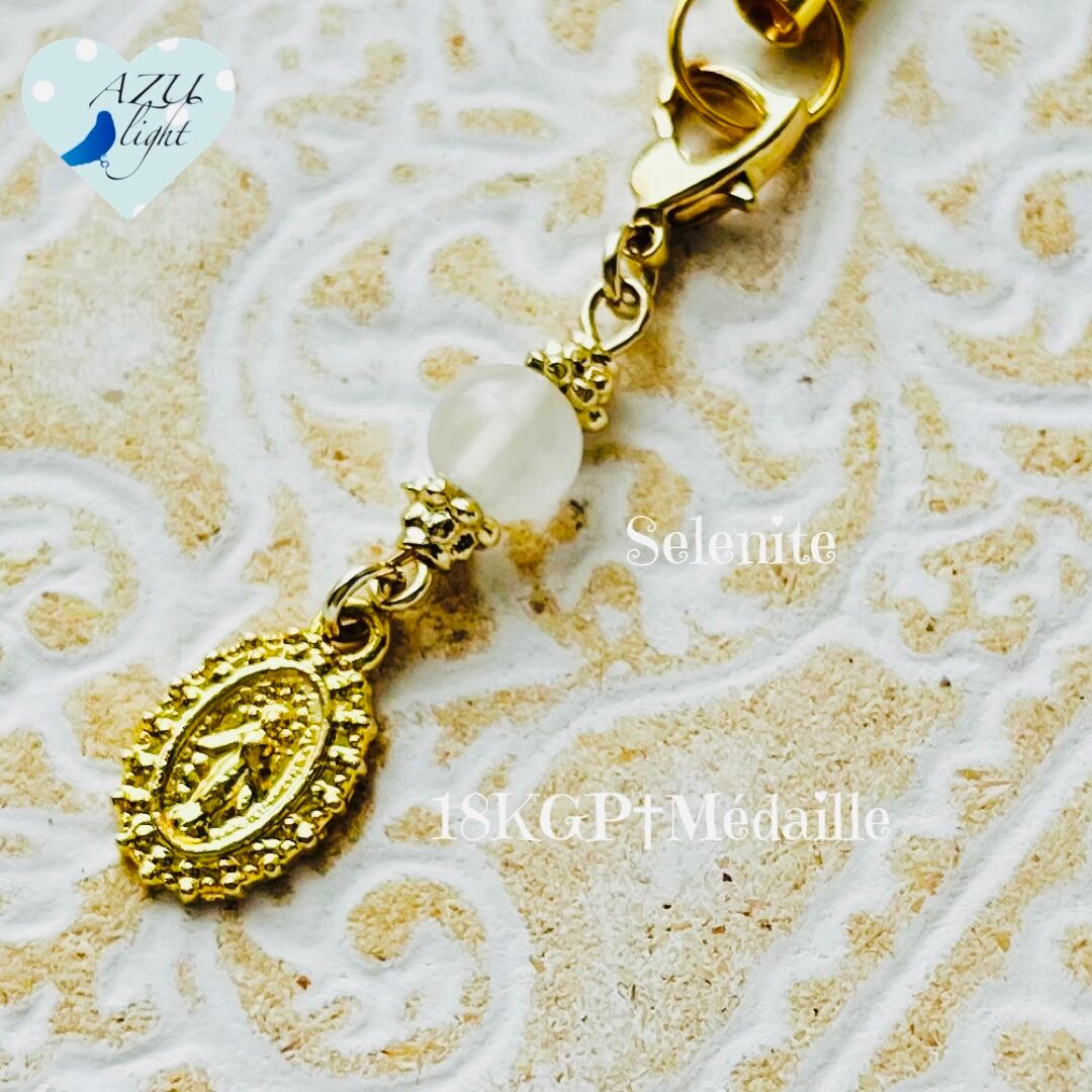 セレナイト(6.5㎜玉)&メダイ(18KGP/11×9㎜)&ハート型カニカン(8×7㎜)を合わせた、2way携帯ストラップです。